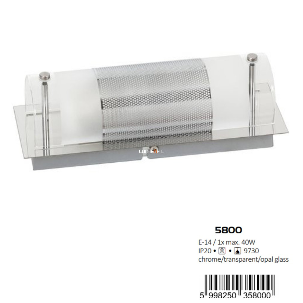 Aplica de perete Periodic Rábalux 5800 este proiectată într-un stil clasic, caracterizat prin utilizarea cromului și a materialelor metalice și din sticlă de culoare opal. Lampa are un singur soclu E14, care poate acomoda o sursă de lumină înlocuibilă, dar sursa de lumină nu este inclusă. Produsul nu este reglabil și are protecție IP20, fiind potrivit pentru utilizare în interior. Lampa are o lungime de 90 mm, o lățime de 240 mm și o înălțime de 90 mm, și cântărește 0,75 kg. Ambalajul are o lățime de 12 cm, o lungime de 11 cm și o înălțime de 28 cm. Periodic Rábalux 5800 este fabricat de Rábalux, iar codul său logistic este 5800.