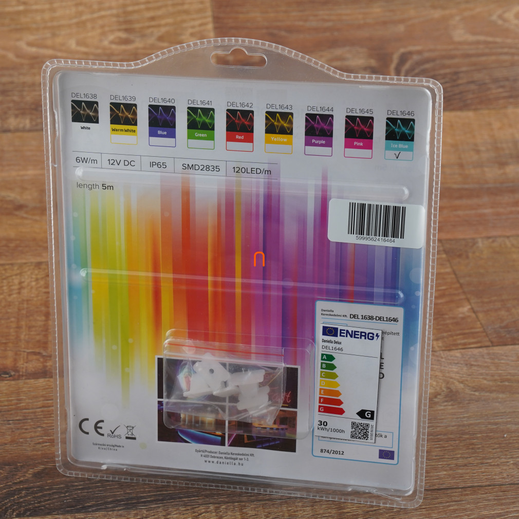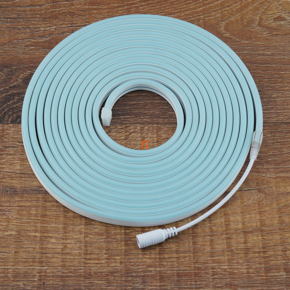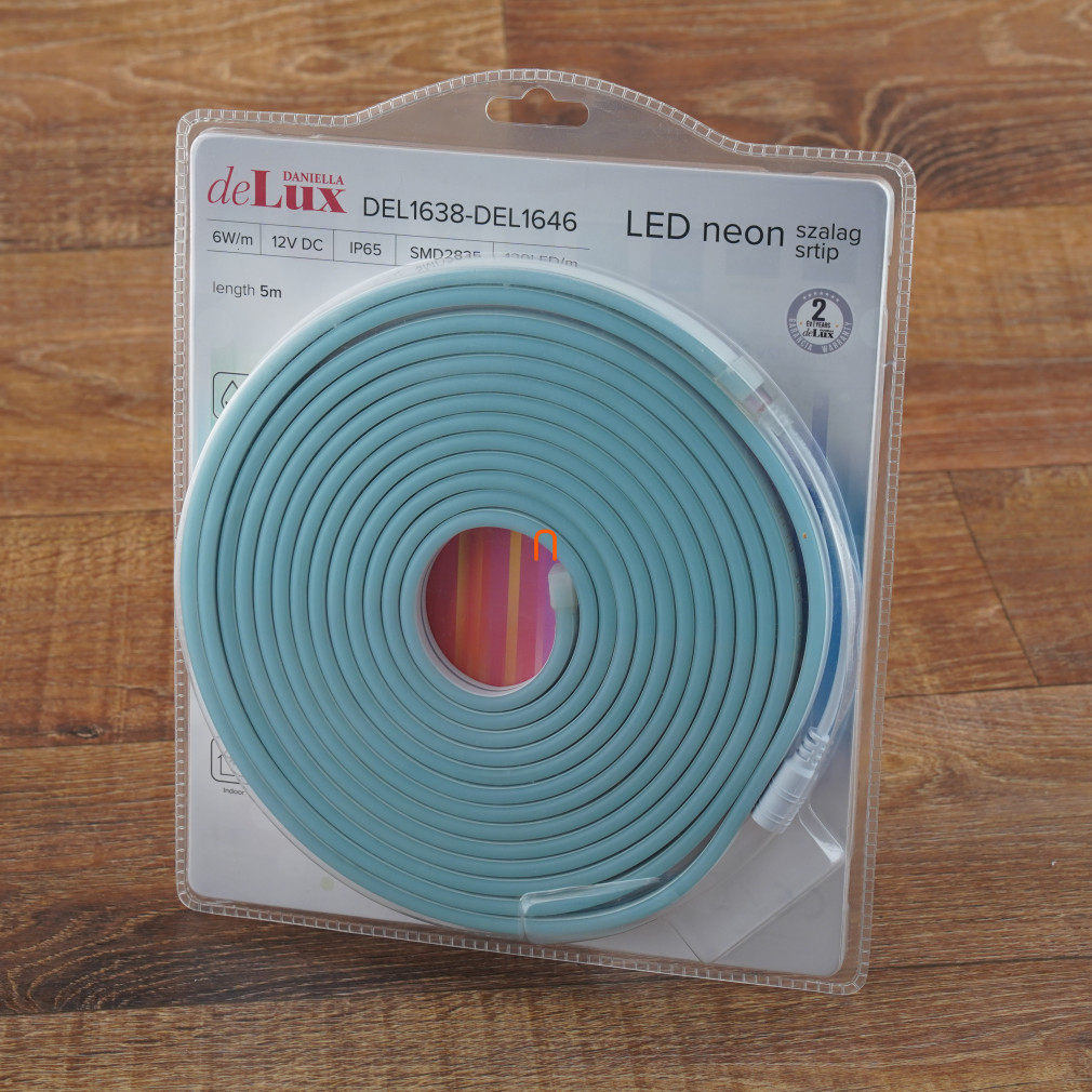 DEL1646 Bandă LED neon flexibilă albastru gheață, 5 m, IP65, 12 V CC, 6 W/fm, 300 lm/m, 120 LED/m, SMD2835, deLux