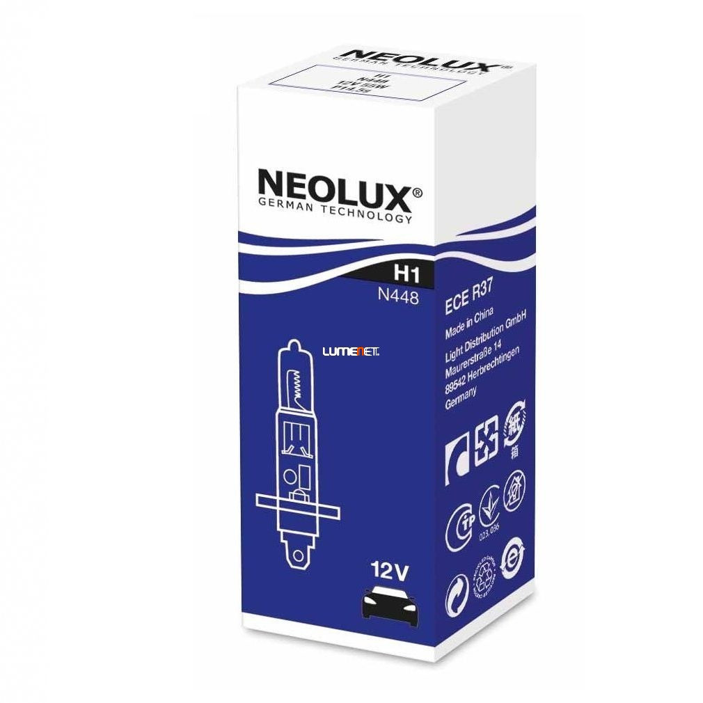 Bec halogen Neolux H1 pentru faruri, 12 V, 3200 K, 1550 lumeni, rezistent la vibrații, pentru motociclete și autoturisme, N448, 1 bucată/cutie