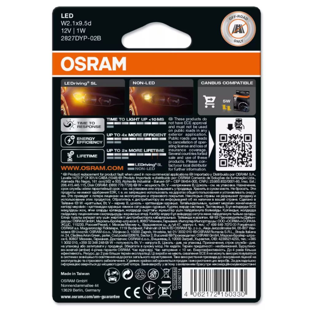 Becul indicator LED OSRAM LEDriving SL W5W GALBEN este alegerea perfectă pentru oricine caută o iluminare modernă, eficientă și estetică pentru vehiculul său. Acest produs este înlocuitorul ideal pentru becurile tradiționale W5W, în special pentru iluminatul indicatoarelor și afișajelor, unde fiabilitatea și timpul de răspuns rapid sunt esențiale. Datorită tehnologiei LED moderne, LEDriving SL W5W consumă cu până la 80% mai puțină energie decât becurile tradiționale, oferind în același timp o lumină galbenă intensă, ușor vizibilă chiar și în condiții de vizibilitate redusă. Produsul are o tensiune nominală de 12 V și un consum de energie de numai 1 W, ceea ce îl face o soluție economică pe termen lung. Fluxul său luminos este de 7 lumeni, ceea ce este suficient pentru o semnalizare care atrage atenția fără a deranja ceilalți participanți la trafic. Datorită dimensiunilor sale compacte – 10 mm diametru și 26,8 mm lungime – poate fi instalat cu ușurință în majoritatea vehiculelor, deoarece este compatibil cu soclul standard W2.1x9.5d. Produsul este plug & play, astfel încât nu este necesară nicio conversie sau cunoștințe specializate pentru instalare – pur și simplu scoateți becul vechi, introduceți LED-ul OSRAM și este gata de utilizare. O caracteristică specială a LEDriving SL W5W YELLOW este că compatibilitatea sa cu Canbus minimizează mesajele de eroare de pe tabloul de bord. Deoarece LED-urile se aprind mai repede decât becurile convenționale, acestea sporesc siguranța rutieră, oferind timpi de reacție mai rapizi pentru șoferii din spatele dvs. Cu o durată de viață de până la 4000 de ore, reduce și mai mult cerințele de întreținere, ceea ce înseamnă că sunt necesare mai puține înlocuiri de becuri, ceea ce nu este doar convenabil, ci și rentabil pe termen lung. Cu toate acestea, este important de reținut că acest produs este destinat exclusiv utilizării în afara drumurilor publice și nu are omologare ECE, deci nu este permisă utilizarea sa pe drumurile publice. Este recomandat în special celor care conduc vehicule off-road, quad-uri sau alte vehicule utilizate în afara drumurilor publice și caută o soluție de iluminat durabilă, foarte vizibilă și de lungă durată. Cu toate acestea, nu este recomandat celor care ar utiliza iluminatul numai pe drumurile publice, deoarece o astfel de utilizare poate fi ilegală. Calitatea fiabilă a OSRAM garantează că LEDriving SL W5W YELLOW va oferi performanțe excelente pe termen lung. Fiind unul dintre cei mai cunoscuți producători de tehnologie de iluminat din lume, OSRAM oferă soluții inovatoare care îndeplinesc pe deplin cerințele vehiculelor moderne. Prin urmare, acest bec LED nu este doar o simplă piesă de schimb, ci rezultatul unei dezvoltări conștiente care combină eficiența, fiabilitatea și un aspect modern. Dacă doriți să treceți la iluminatul cu LED-uri, alegeți becul OSRAM LEDriving SL W5W YELLOW și experimentați diferența încă de la prima utilizare.