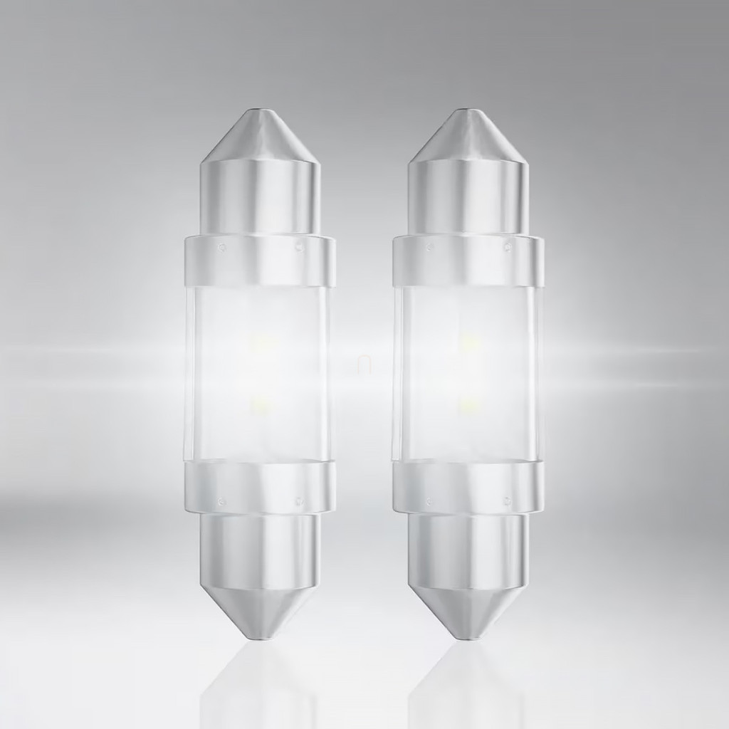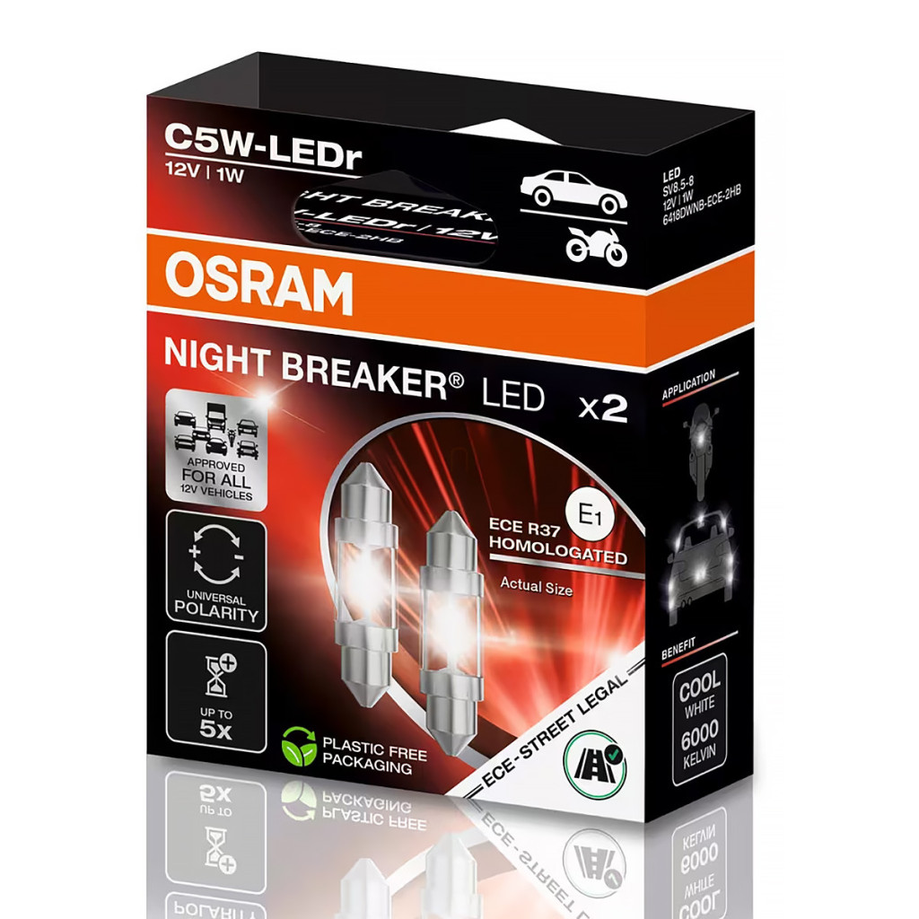 Osram Night BreakerLED C5W ECE este un bec LED/bec indicator auto premium care oferă o lumină LED modernă, albă, cu temperatura de culoare de 6000 K, în locul becurilor halogene tradiționale C5W. Este complet omologat ECE R37, fiind potrivit pentru utilizarea în vehicule de 12 V oriunde se utilizează becuri C5W (de exemplu, plăcuțe de înmatriculare, lumini de poziție laterale, iluminat interior). Tehnologia LED oferă un consum de energie cu până la 80% mai mic și o durată de viață de până la cinci ori mai lungă decât becurile convenționale. Date tehnice: tensiune nominală 12 V, tensiune de testare 13,5 V, consum de energie 1 W, flux luminos ~45 lm (±25%), lungime 36 mm, diametru 11 mm, soclu SV8.5-8, durată de viață B3:1500 h, Tc:3000 h. Acest bec de schimb oferă o lumină albă rece și modernă, îmbunătățind în același timp iluminatul vehiculului dvs. cu un consum redus de energie și o durată de viață lungă.