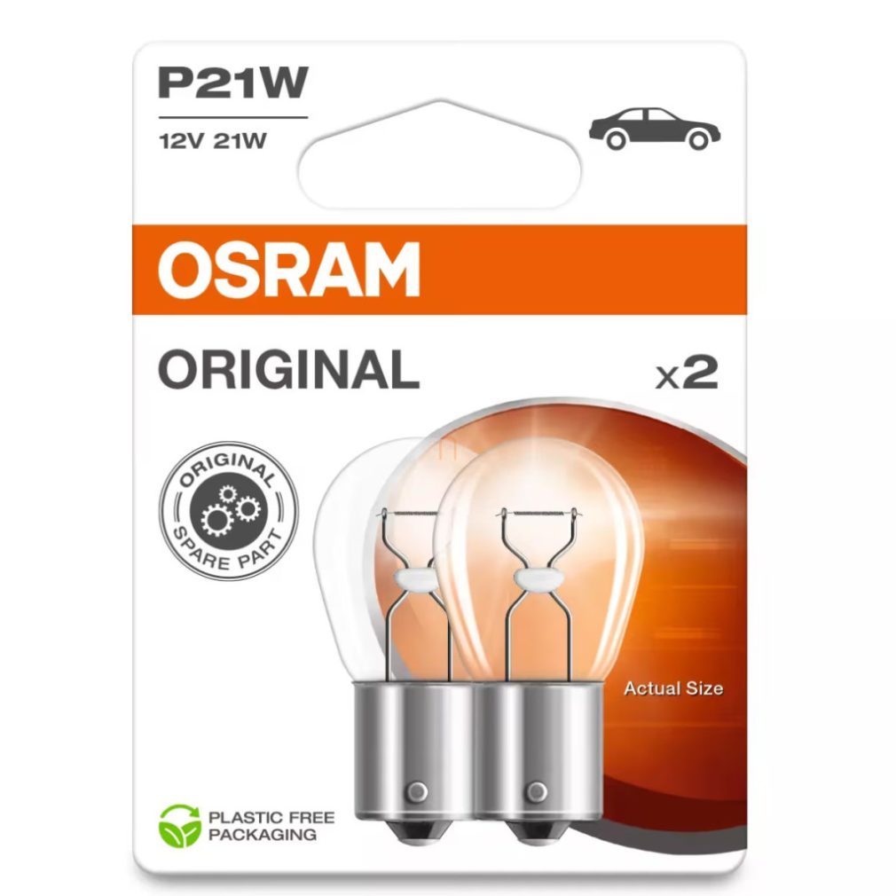 Bec standard P21W de calitate Osram, vândut în pachete de două bucăți. Prețul afișat este pentru două becuri.