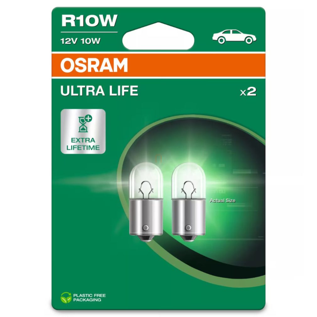Bec indicator Osram Ultra Life R10W, 12 V, soclu BA15s, dimensiuni reduse, putere luminoasă de 125 lumeni, durată de viață de până la patru ori mai lungă, 5008ULT-2BL, 2 bucăți/ambalaj blister