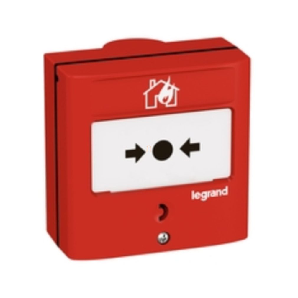 Buton manual LeGrand pentru sisteme de detectare și alarmare incendiu, cu acțiune simplă, roșu RAL 3000, cu 1 contact inversor-5A-24V=, IP30-IK07 - 138069