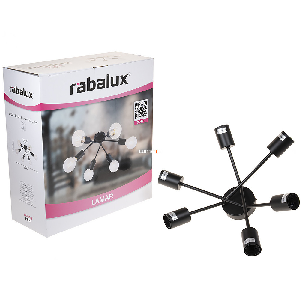 Candelabrul Rábalux 3990 Minimal în culoare neagră are șase socluri E27, astfel încât poate fi utilizat cu surse de lumină înlocuibile. Corpul de iluminat este fabricat din metal, ceea ce asigură durabilitate și un aspect modern. Are un grad de protecție IP20, fiind potrivit pentru utilizare în interior. Candelabrul are o lățime de 380 mm, o înălțime de 155 mm și o greutate de 1,4 kg. Produsul nu include o sursă de lumină; luminozitatea și culoarea luminii depind de becul utilizat. Lampa nu este reglabilă, iar designul său simplu și curat se potrivește interioarelor minimaliste. Dimensiunile ambalajului sunt: 18 cm lățime, 41 cm lungime și 45 cm înălțime.