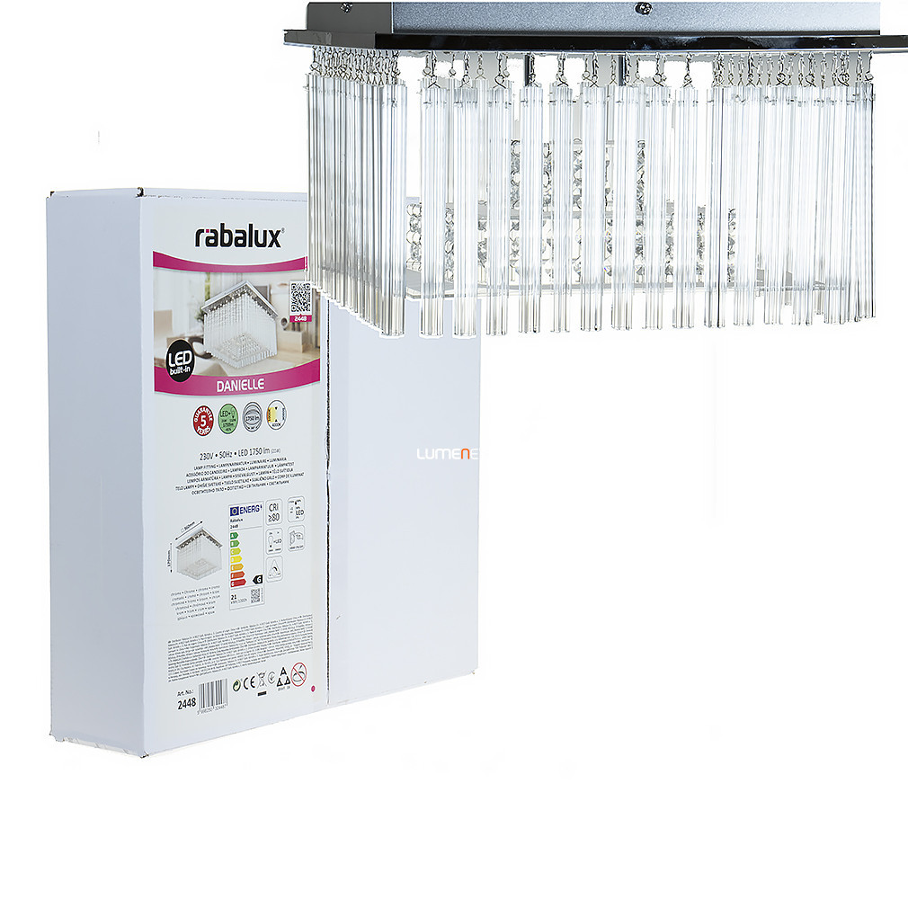 Candelabrul modern din cristal cu LED-uri Danielle Rábalux 2448 este un corp de iluminat elegant pentru tavan, fabricat de Rábalux. Lampa are un modul LED încorporat de 21 de wați, care oferă o putere luminoasă de 1750 lumeni la o temperatură de culoare albă rece de 4000 K. Produsul nu este reglabil și are protecție IP20, fiind potrivit pentru utilizare în interior. Candelabrul este fabricat din metal, plastic și sticlă de cristal, într-o combinație de culori argintiu și transparent. Corp de iluminat are un diametru de 360 mm, o înălțime de 170 mm și o greutate de 4,15 kg. Durata medie de viață este de 20.000 de ore, iar sursa de lumină face parte din produs. Designul modern și materialele de înaltă calitate asigură o funcționare fiabilă pe termen lung.