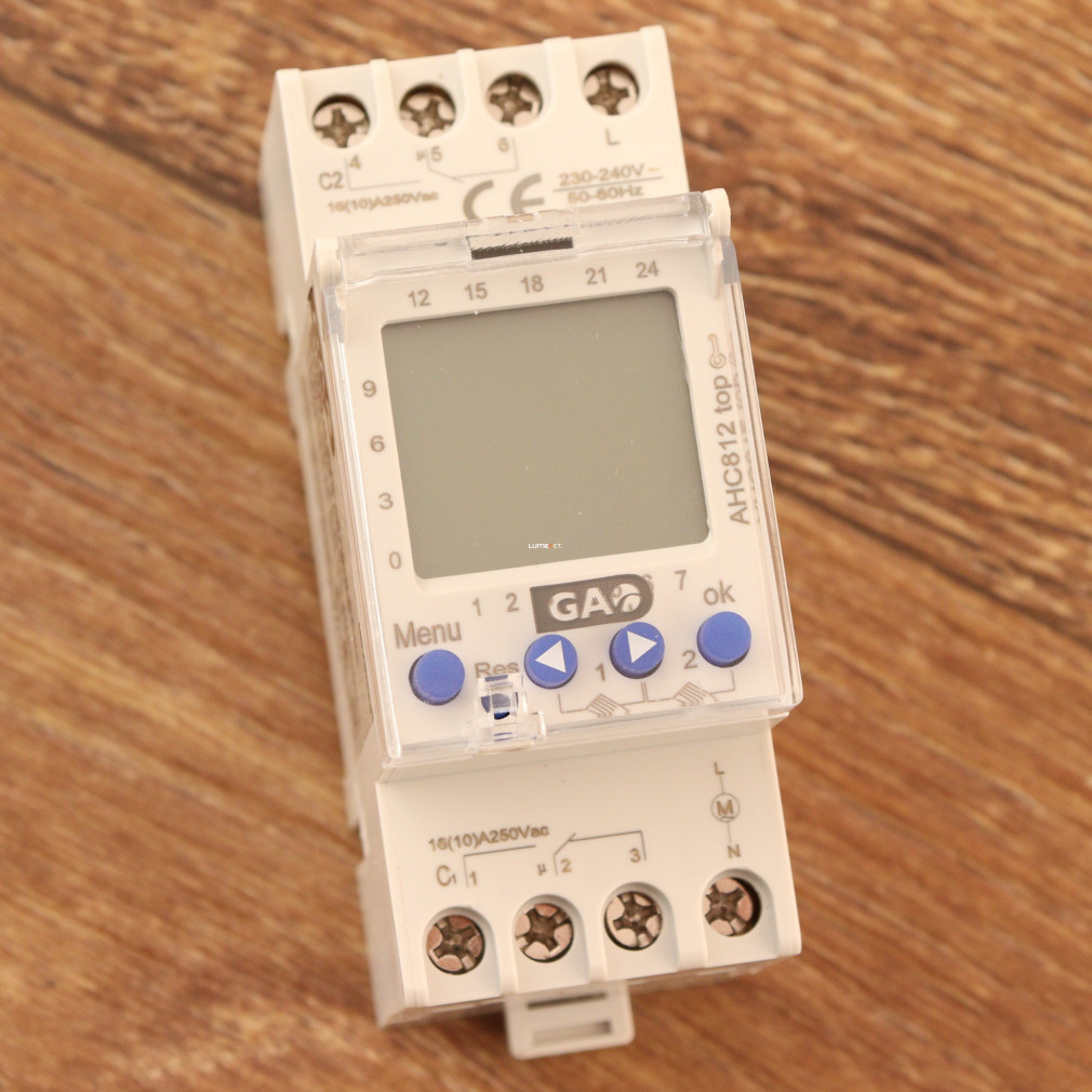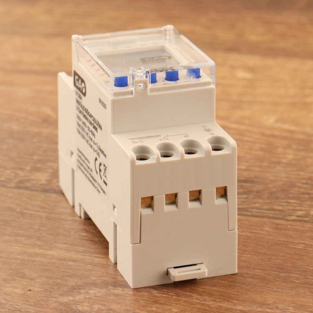 Ceasul digital cu comutare GAO (program săptămânal) cu 2 canale, max. 2300 W, 16 A, modul DIN 8138H poate fi utilizat pentru a seta pornirea și oprirea circuitelor individuale direct la dulapul de comutație sau la întrerupătoarele miniaturale în 44 de locații de memorie, cu schimbarea programată a orei de iarnă/vară. Comutatorul temporizat cu două module și 2 canale poate fi protejat împotriva accesului neautorizat prin introducerea unui cod PIN.