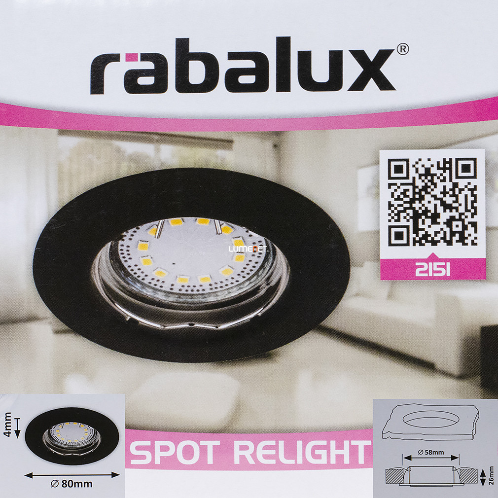 Spotul Spot Relight Rábalux 2151 este proiectat într-un stil funcțional și poate fi încastrat în tavane suspendate. Corp de iluminat este negru, fabricat din metal și are o singură soclu GU5.3, care poate fi echipat cu o sursă de lumină înlocuibilă. Produsul are un diametru de 80 mm, o înălțime de 4 mm și o adâncime de instalare de 26 mm. Are un grad de protecție IP20, ceea ce îl face potrivit pentru utilizare în interior. Dimensiunile ambalajului sunt 9x9x4 cm, iar produsul cântărește 0,07 kg. Corpul de iluminat nu include o sursă de lumină; temperatura culorii, puterea și fluxul luminos variază în funcție de sursa de lumină selectată. Producătorul este Rábalux.