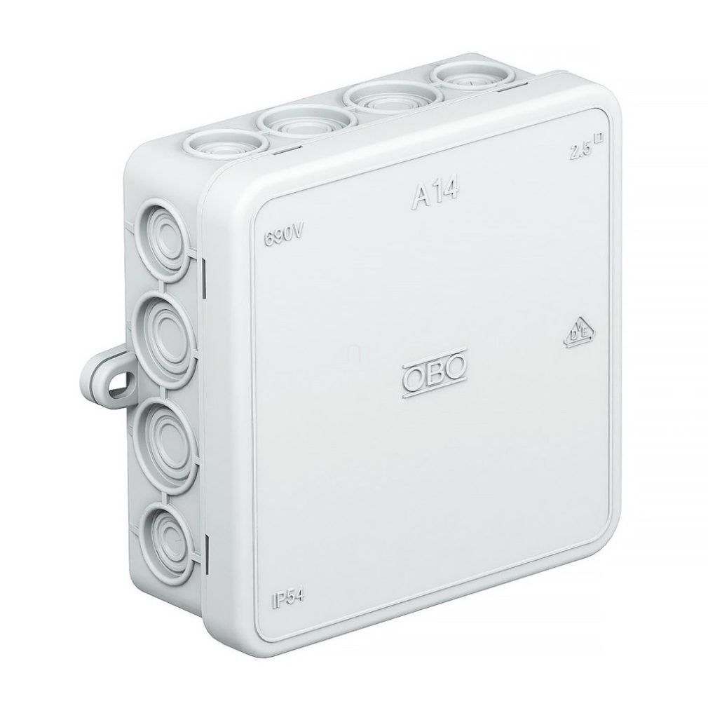 Cutie de joncțiune 100x100x38 A14 OBO 2000378 fără bloc terminal PE gri deschis