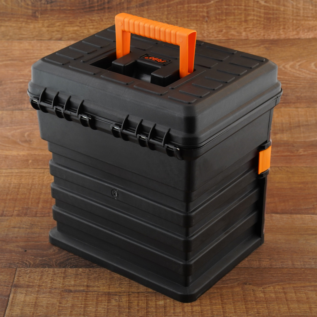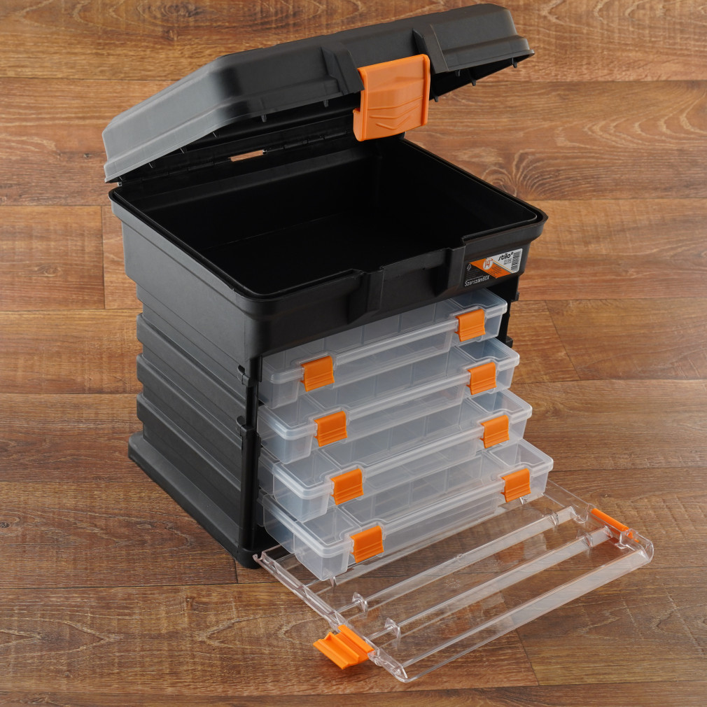 Cutia de scule Stilo 14" este o soluție de depozitare compactă, dar extrem de practică, cu patru sortimente extensibile, fiind alegerea ideală pentru mecanici, pasionații de bricolaj și oricine dorește să-și depoziteze sculele și piesele mici într-un mod organizat.