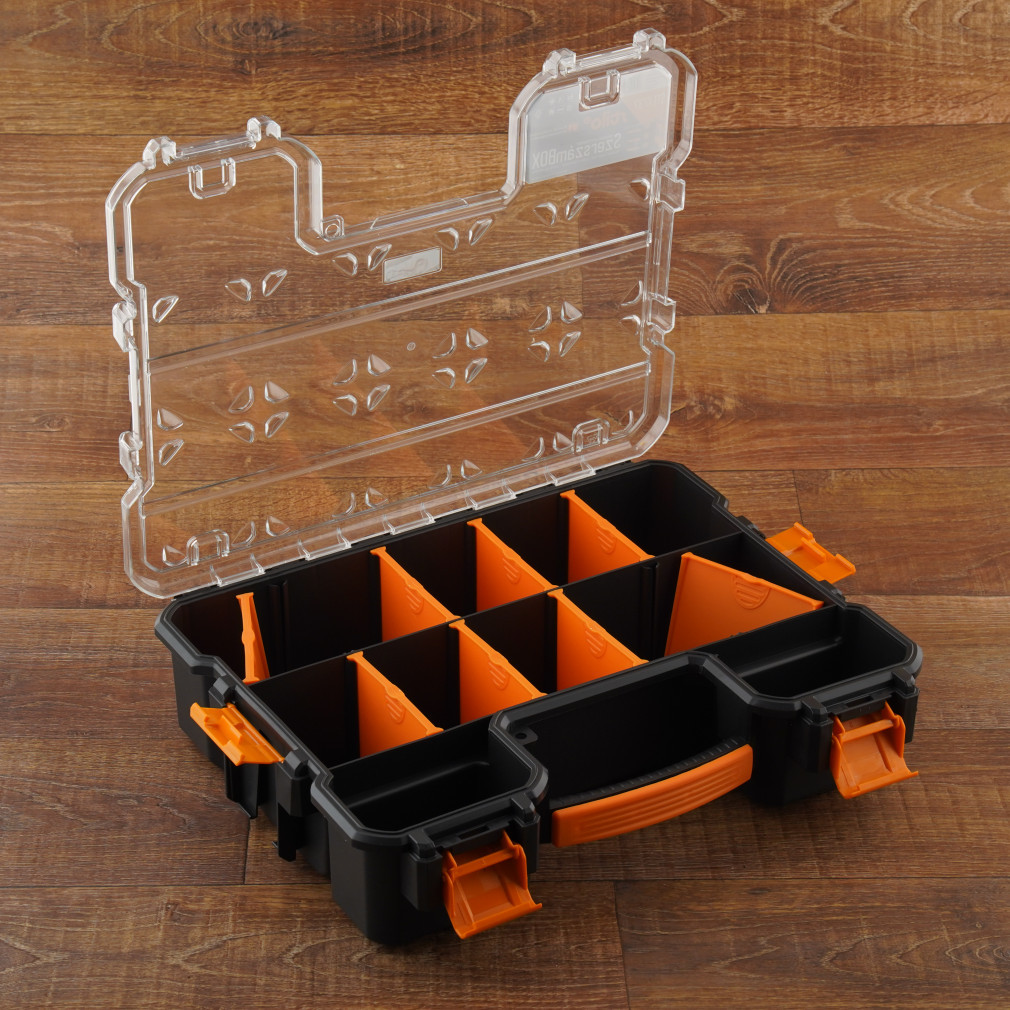 Datorită separatoarelor detașabile, dimensiunea compartimentelor poate fi ajustată după dorință, astfel încât să puteți adapta întotdeauna dispunerea interiorului la dimensiunea articolelor pe care doriți să le depozitați. Fie că depozitați scule mai mari sau șuruburi mici, totul poate fi organizat cu ușurință în interior.