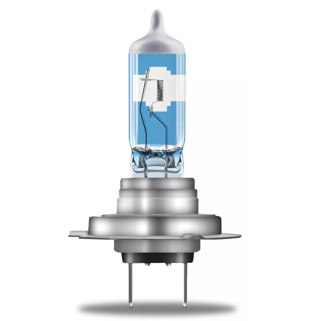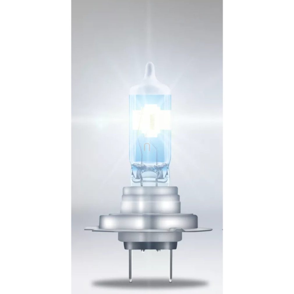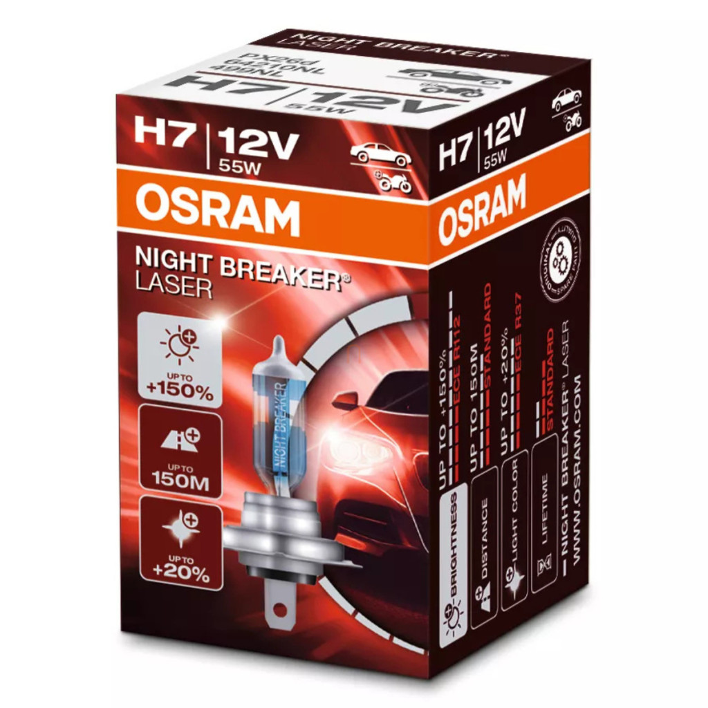 Becul halogen pentru faruri Osram Night Breaker Laser H7 este un bec halogen pentru faruri orientat către performanță, fabricat folosind tehnologia de ablație cu laser pentru a obține o luminozitate mai mare decât becurile halogen convenționale. Becul are o tensiune nominală de 12 V și funcționează la 55 W, fiind compatibil cu majoritatea sistemelor de faruri halogen pentru autoturisme. Fluxul luminos nominal este de aproximativ 1500 lumeni, cu o toleranță de ±10%, ceea ce permite o putere luminoasă mai puternică și mai spectaculoasă. Tehnologia permite luminii să ajungă până la 150 m, oferind o vizibilitate mai bună la conducerea pe timp de noapte. Lumina poate fi cu până la 20% mai albă decât becurile halogen care îndeplinesc cerințele legale minime, rezultând o iluminare mai modernă, cu un contrast mai mare. Becul B3 are o durată de viață de aproximativ 150 de ore, ceea ce înseamnă că, potrivit producătorilor, 97% dintre lămpi vor funcționa în continuare după această perioadă, în timp ce durata de viață Tc de aproximativ 250 de ore indică durabilitatea măsurată în condiții de temperatură stabilă. Temperatura culorii luminii este albă mai caldă în comparație cu becurile cu halogen, ceea ce oferă un contrast mai bun în gama medie și se potrivește în carcasa farurilor vehiculelor (categorie aprobată ECE). Lampa are o bază PX26d și o lungime de aproximativ 59 mm, ceea ce o face ușor de înlocuit cu un bec standard H7.