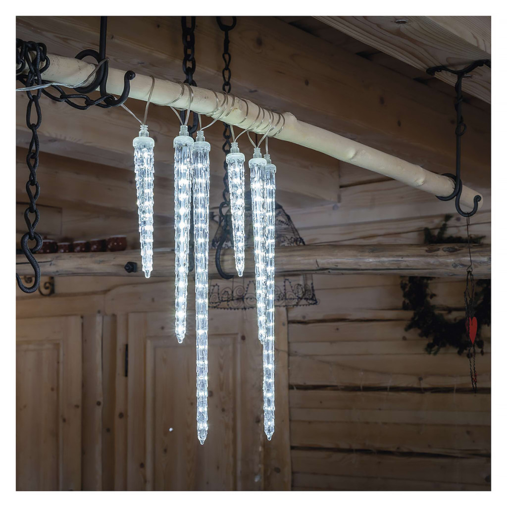 6 bucăți de lumini în formă de gheață, cu lungimea de 2 metri, care conferă un aspect elegant și curat oricărei decorațiuni festive, datorită luminii albe reci. Sunt alegerea ideală pentru decorarea cu stil a ferestrelor, balustradelor, teraselor sau chiar a pereților interiori.