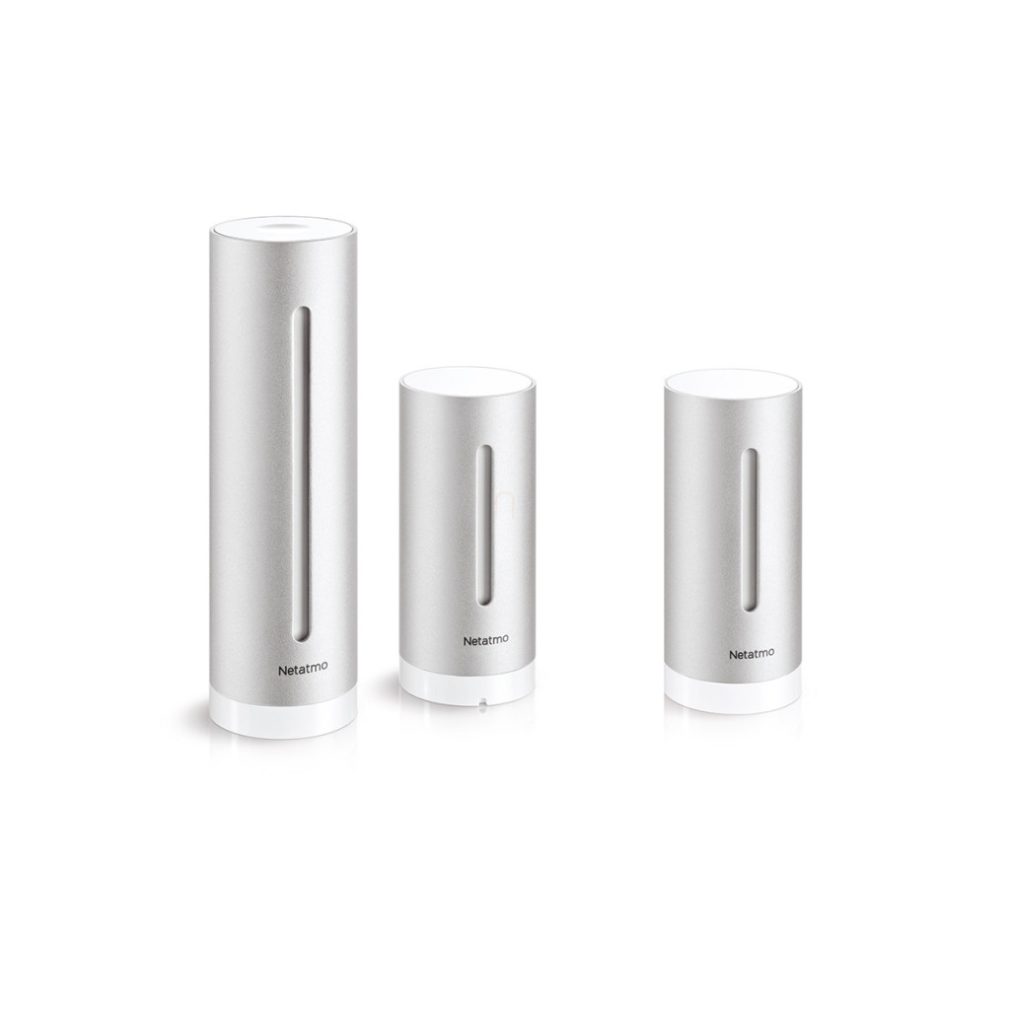 Kit stație meteorologică inteligentă Netatmo, design turn, include: 1x stație meteorologică, +1x modul interior, culoare aluminiu alb, conexiune Legrand