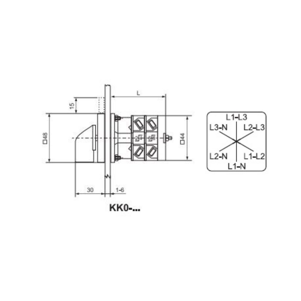 KK0-20-6036 Comutator voltmetru, comutator manual acționat cu mâner 20 A, pentru tensiune trifazată și cu 3 fire fără poziție 0 IP44, Ganz