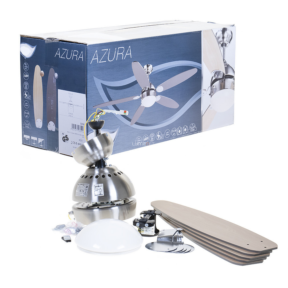 Lampa cu ventilator Azura Globo 308 este o soluție modernă de iluminat pentru tavan, realizată dintr-o combinație de metal și lemn în culori maro și gri. Produsul are un diametru de 1320 mm, o înălțime de 406 mm și o greutate de 6,68 kg. Are o priză E14, care poate fi echipată cu o sursă de lumină înlocuibilă. Temperatura culorii, fluxul luminos și puterea iluminatului depind de becul selectat. Corpul de iluminat nu include o sursă de lumină și nu este reglabil. Ventilatorul are trei setări de viteză și poate roti în două direcții, care pot fi controlate cu un comutator cu tragere. Produsul are un grad de protecție IP20 și este potrivit pentru utilizare în interior. Dimensiuni ambalaj: 54 cm lungime, 24 cm lățime și 27 cm înălțime.