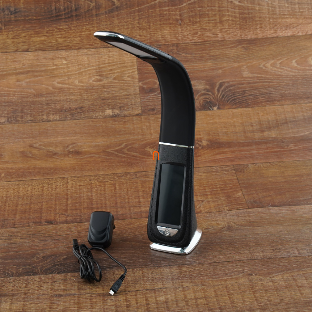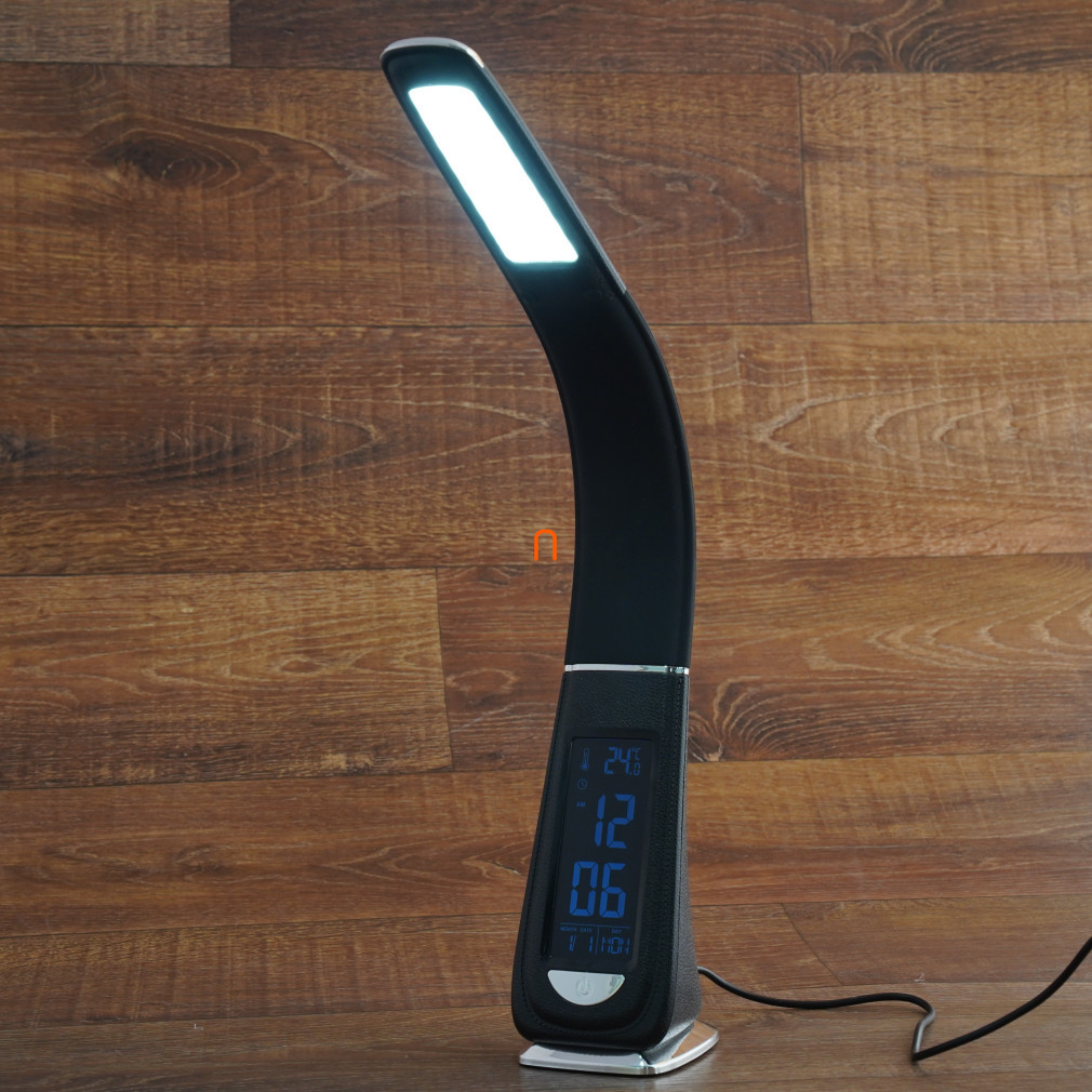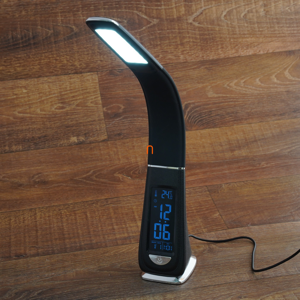Lampa de birou cu LED, intensitate reglabilă, afișaj pentru dată, oră și temperatură, mod alarmă, 4 W, 370 lm, 5000 K, aspect piele neagră, cu adaptor de rețea, deLux DEL1682