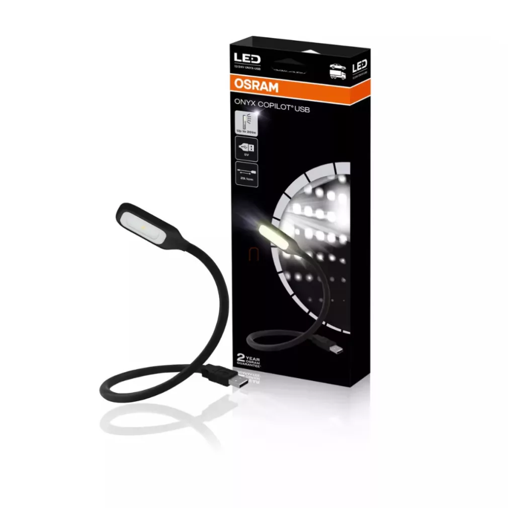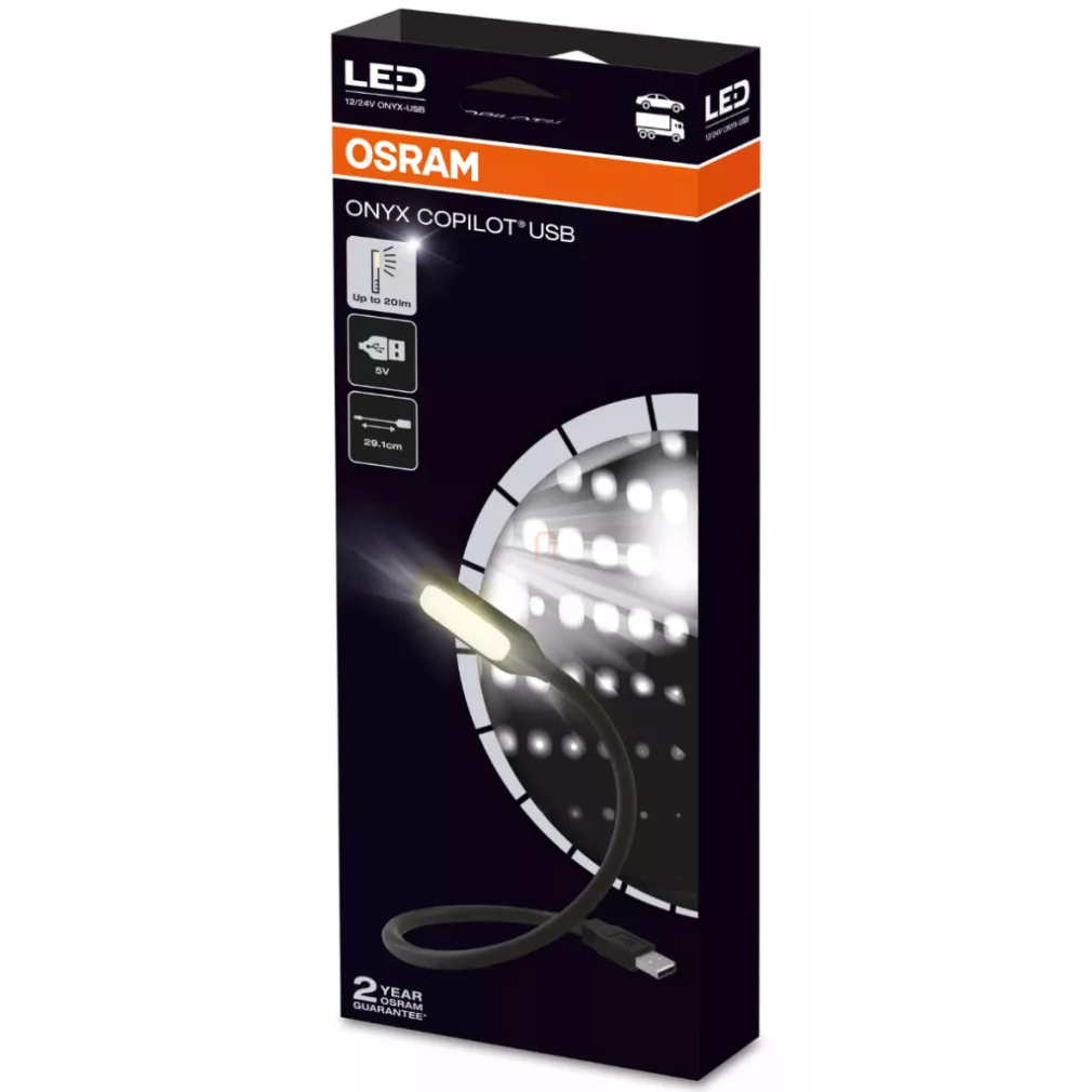 Lampă de citit LED flexibilă Osram Onyx Copilot USB, lumină albă caldă 3200 K, 20 lumeni, conexiune USB, lungime 394 mm, silicon negru, pentru iluminatul interior al vehiculelor, ONYX-USB