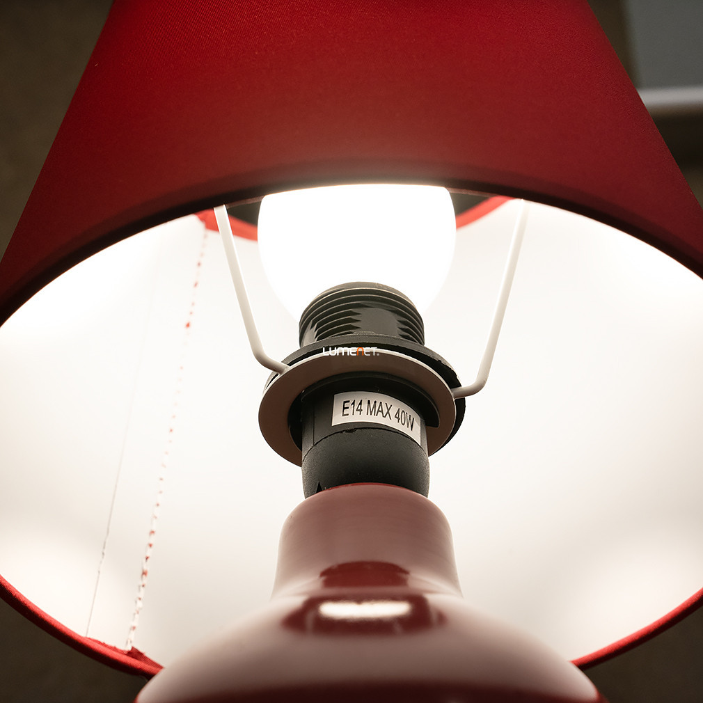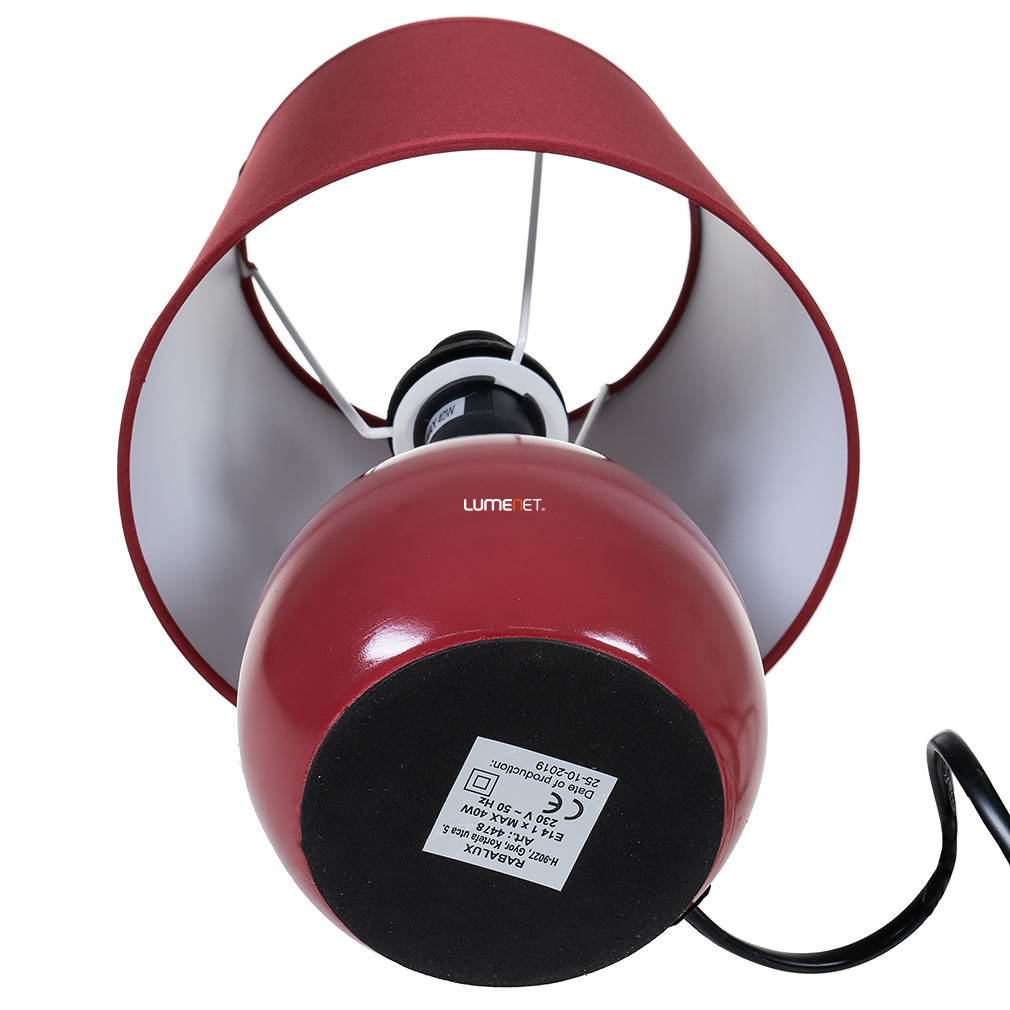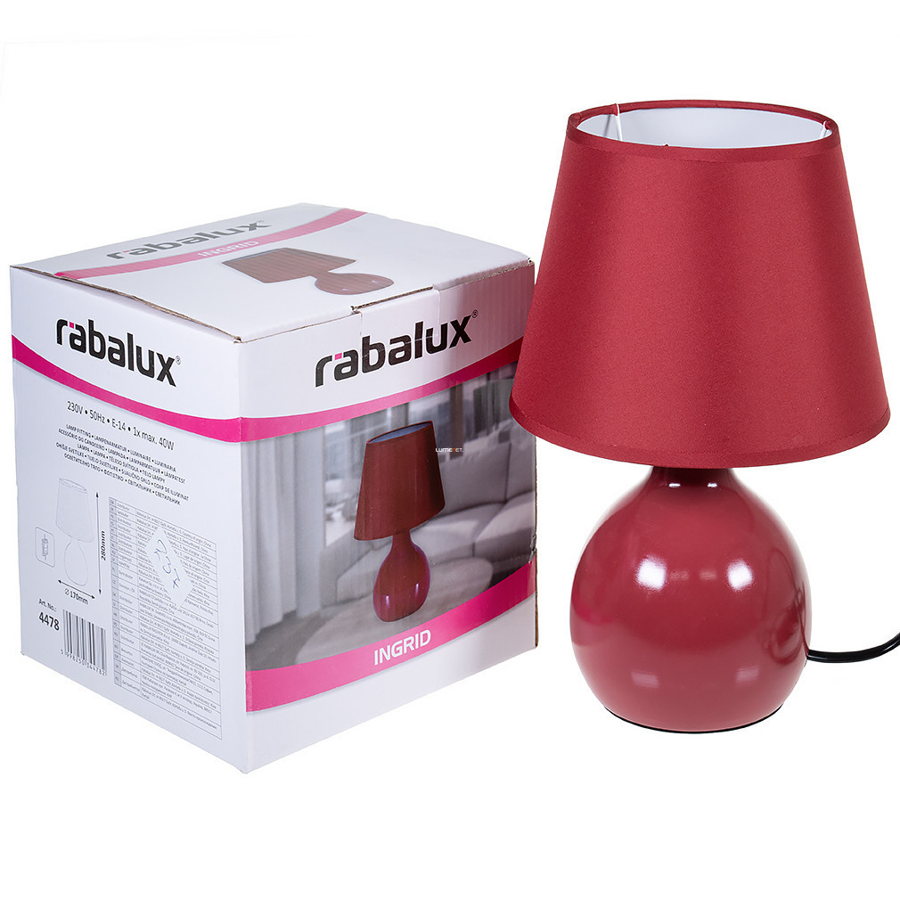 Lampa de masă Ingrid Rábalux 4478 în culoarea burgund este proiectată într-un stil modern, cu o înălțime de 28 cm, corp din ceramică și abajur din material textil. Produsul are un soclu E14, potrivit pentru o sursă de lumină înlocuibilă, dar sursa de lumină nu este inclusă. Lampa are un grad de protecție IP20, deci este recomandată pentru utilizare în interior. Lampa cu întrerupător nu este reglabilă, are un diametru de 170 mm și cântărește 0,58 kg. Dimensiunile ambalajului sunt 17x17x19 cm. Lampa este fabricată de Rábalux, cod logistic 4478.