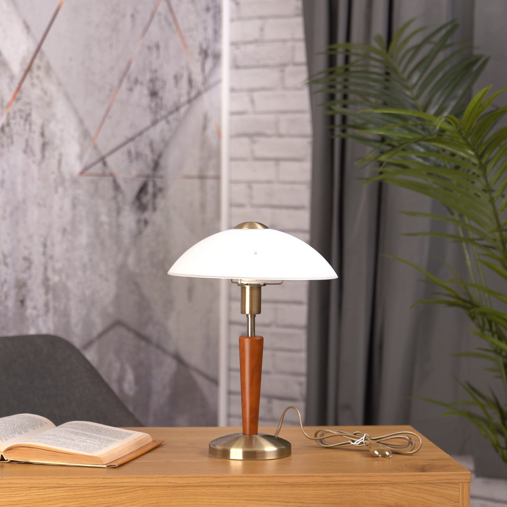 Lampa de masă Eglo Solo 1 87256, de culoare nuc, cu înălțimea de 35 cm, este realizată în stil art deco. Abajurul este fabricat din oțel și sticlă, într-o combinație de culori alb și maro. Are un soclu E14, care poate fi utilizat cu o sursă de lumină înlocuibilă (sursa de lumină nu este inclusă). Comutatorul tactil cu control reglabil vă permite să reglați intensitatea iluminatului în funcție de necesități. Produsul are protecție IP20, fiind potrivit pentru utilizare în interior. Lampa are un diametru de 260 mm, o înălțime de 350 mm și o greutate de 1,73 kg. Dimensiunile ambalajului sunt 18 cm lățime, 28 cm lungime și 33 cm înălțime. Eglo Solo 1 87256 este fabricată de EGLO.