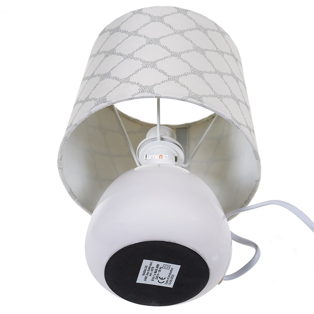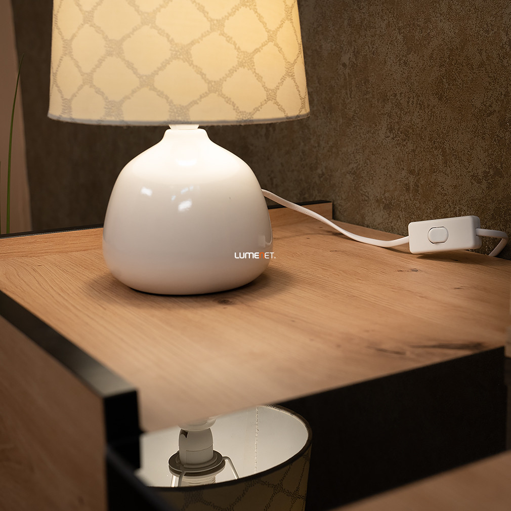 Lampa de masă din ceramică, 26 cm - Ellie Rábalux 4379 este o soluție modernă de iluminat pentru casă, de culoare albă, fabricată de Rábalux. Lampa are o bază din ceramică și un abajur din material textil, cu o înălțime totală de 26 cm și un diametru de 18 cm. Este echipată cu un soclu E14, care poate fi prevăzut cu o sursă de lumină înlocuibilă, neincluse. Lampa nu este reglabilă și este acționată de un întrerupător cu cablu. Are un grad de protecție IP20, fiind potrivită pentru utilizare în interior. Produsul cântărește 0,6 kg, iar dimensiunile ambalajului său sunt 19 cm lățime, 18 cm lungime și 18 cm înălțime. Codul său logistic este 4379.