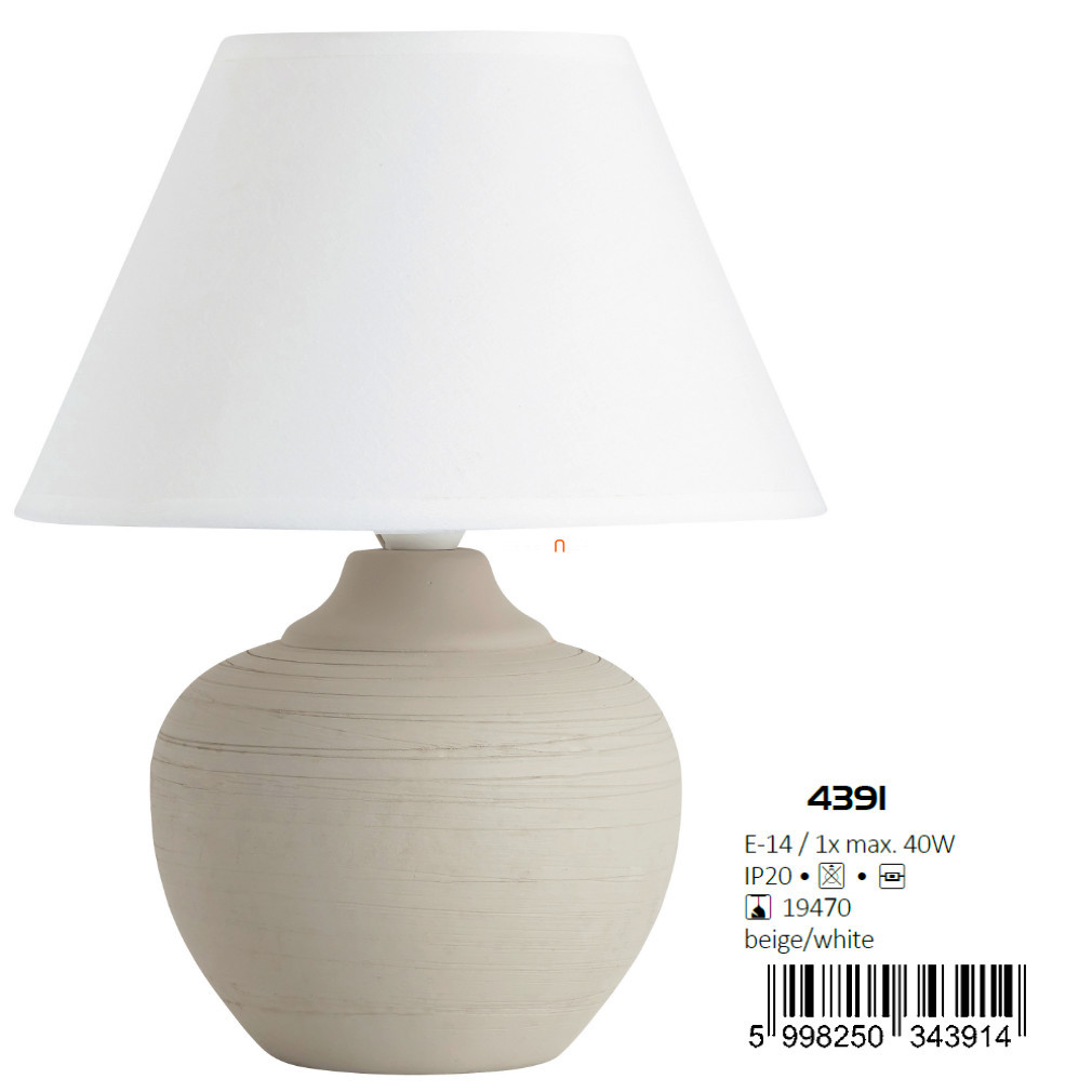 Lampa de masă Molly Rábalux 4391 are un stil modern, bază din ceramică bej și abajur din material textil alb. Lampa are o înălțime de 25 cm, un diametru de 20,5 cm și o greutate de 0,5 kg. Este echipată cu un soclu E14, care poate fi prevăzut cu o sursă de lumină înlocuibilă, dar sursa de lumină nu este inclusă în produs. Lampa poate fi aprinsă și stinsă cu un întrerupător cu cablu și nu este reglabilă. Are un grad de protecție IP20, ceea ce o face potrivită pentru utilizare în interior. Dimensiunile ambalajului sunt 19x19x19 cm. Produsul este fabricat de Rábalux, cod logistic 4391.