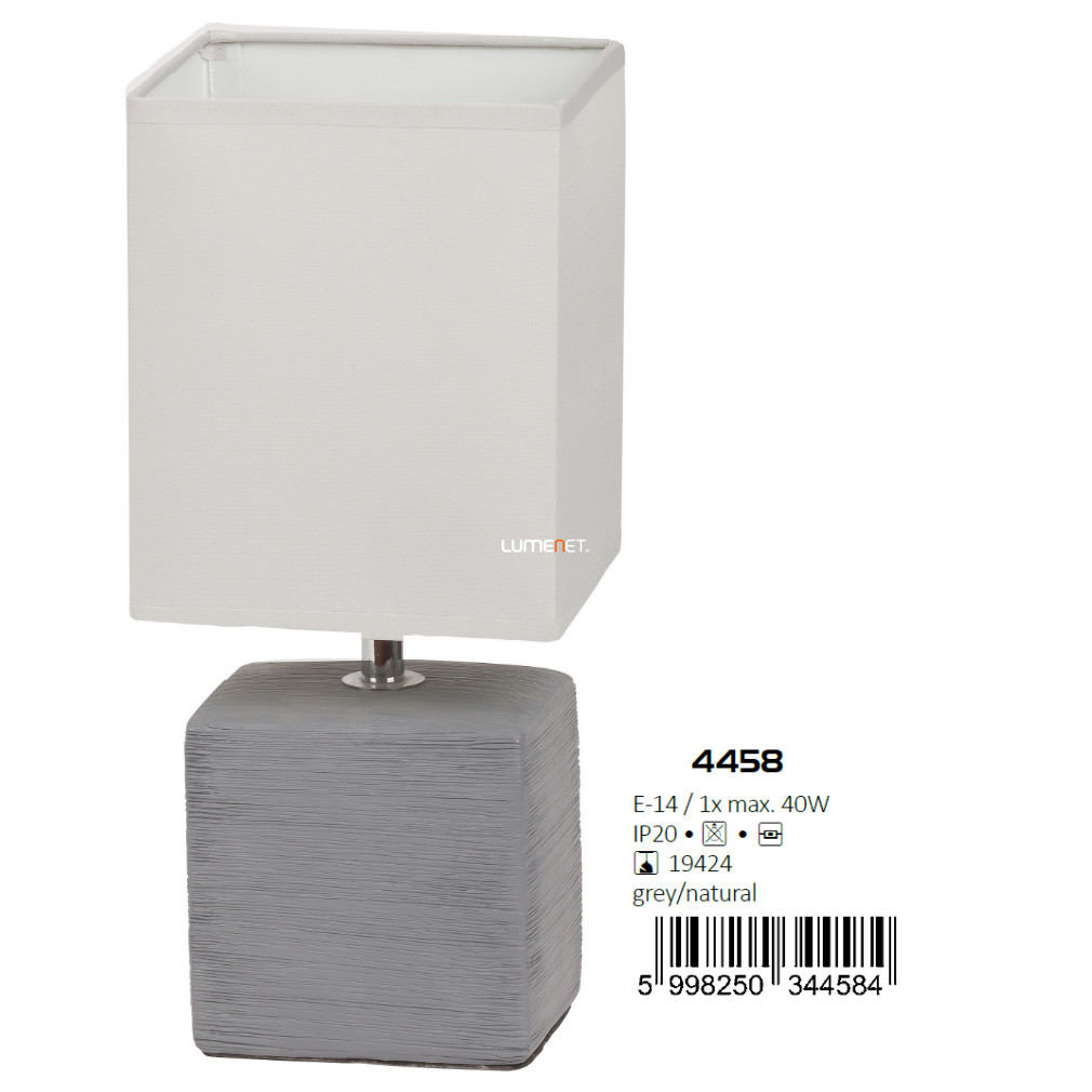 Lampa de masă din material textil Orlando Rábalux 4458, cu designul său modern, unghiular și înălțimea de 30 cm, este alegerea ideală pentru orice interior. Lampa este disponibilă în culorile alb și gri, cu bază din ceramică și abajur din material textil, conferindu-i un aspect curat. Are un soclu E14, pentru care sursa de lumină poate fi selectată separat, astfel încât fluxul luminos, temperatura culorii și puterea să poată fi ajustate în funcție de nevoile utilizatorului. Lampa are un grad de protecție IP20, fiind potrivită pentru utilizare în interior. Este controlată de un întrerupător cu cablu și nu este reglabilă. Produsul cântărește 0,7 kg, are o lățime de 13,5 cm și o înălțime de 30 cm. Dimensiunile ambalajului: 13 cm lățime, 11 cm lungime, 18 cm înălțime. Lampa este fabricată de Rábalux.
