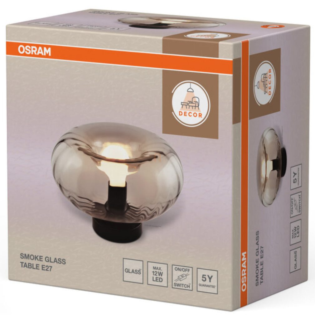 Lampă de masă din sticlă, 17,6 cm - Osram Decor Smoke Glass, cu soclu 1xE27, cablu de 1,5 metri, 220-240 V