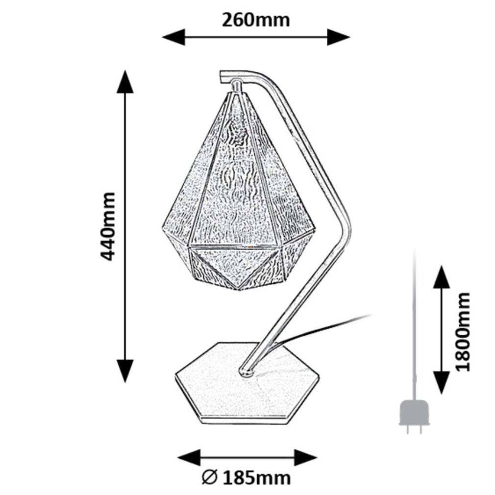 Lampa de masă Norah Rábalux 74201 are o bază hexagonală de culoare aurie și un abajur din sticlă transparentă. Lampa are o înălțime de 44 cm, o lățime de 18,5 cm, o lungime de 26 cm și o greutate de 1,65 kg. Produsul este echipat cu un soclu E14, care poate fi prevăzut cu o sursă de lumină înlocuibilă. Puterea maximă, fluxul luminos și temperatura culorii variază în funcție de becul utilizat. Lampa funcționează la o tensiune nominală de 230 V și are un grad de protecție IP20. Cablul are o lungime de 1,8 metri și este acoperit cu un înveliș textil, care îi conferă un aspect elegant. Materialul principal al lămpii este metalul, iar abajurul este din sticlă. Produsul nu include o sursă de lumină. Dimensiunile ambalajului sunt 49x32x27 cm.