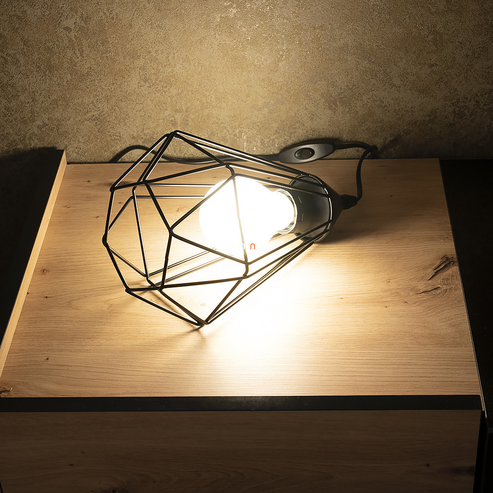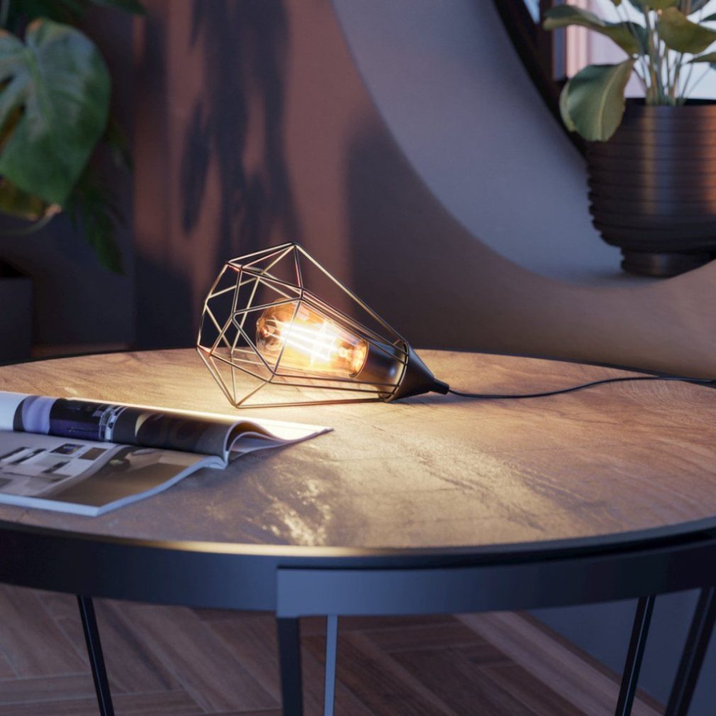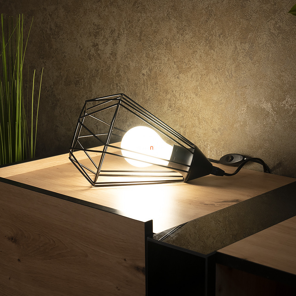 Tarbes Eglo 94192 este o lampă de masă cu un singur soclu, înaltă de 26 cm, cu un design în formă de grilă, care este un exemplu perfect al modului în care un corp de iluminat poate fi atât simplu, cât și extrem de distinctiv. La fel ca și celelalte modele din colecția Tarbes, acest model captivează prin combinația dintre geometria curată, estetica metalică brută și designul industrial, în timp ce dimensiunile reduse și designul practic îl fac ușor de amplasat aproape oriunde. În situațiile în care funcționalitatea și designul sunt la fel de importante, această lampă este una dintre cele mai bune alegeri. Întreaga lampă este realizată din metal, iar structura sa deschisă din plasă metalică permite luminii să se răspândească liber, proiectând umbre unice în jurul său. Cadrul metalic acoperit cu pulbere neagră creează un efect vizual stabil și atemporal, integrându-se cu ușurință într-o varietate de stiluri de interior: poate fi integrat cu ușurință în spații loft, scandinave, minimaliste moderne, vintage sau chiar industriale. Dimensiunile reduse ale lămpii o fac discretă, dar forma sa unică asigură că nu trece neobservată. Acest lucru o face perfectă pentru noptiere, birouri, comode sau chiar tejghele în restaurante, zone de recepție și cafenele, unde nu numai lumina, ci și atmosfera sunt importante. Soclul E27 este un standard clasic care poate fi utilizat cu aproape orice tip de sursă de lumină. Cu toate acestea, alegerea sursei de lumină potrivite este, de asemenea, extrem de importantă în acest caz. Datorită structurii complet deschise, nu se recomandă utilizarea LED-urilor tradiționale cu filament și sticlă transparentă, deoarece acestea pot provoca un efect de strălucire, mai ales atunci când sunt amplasate direct la nivelul ochilor. Prin urmare, sursele de lumină LED cu filament din sticlă opală sau fumurie sunt alegerea ideală. Versiunea opală oferă o lumină uniformă și difuză, care rezultă într-o iluminare mai moale, nu distrage atenția ochilor și este mult mai confortabilă, de exemplu pentru citit sau relaxare seara. Sursele de lumină LED cu sticlă fumurie oferă, de asemenea, o nuanță plăcută și mai caldă a luminii și se armonizează elegant cu rama metalică neagră, servind ca element decorativ chiar și atunci când lampa nu este aprinsă.