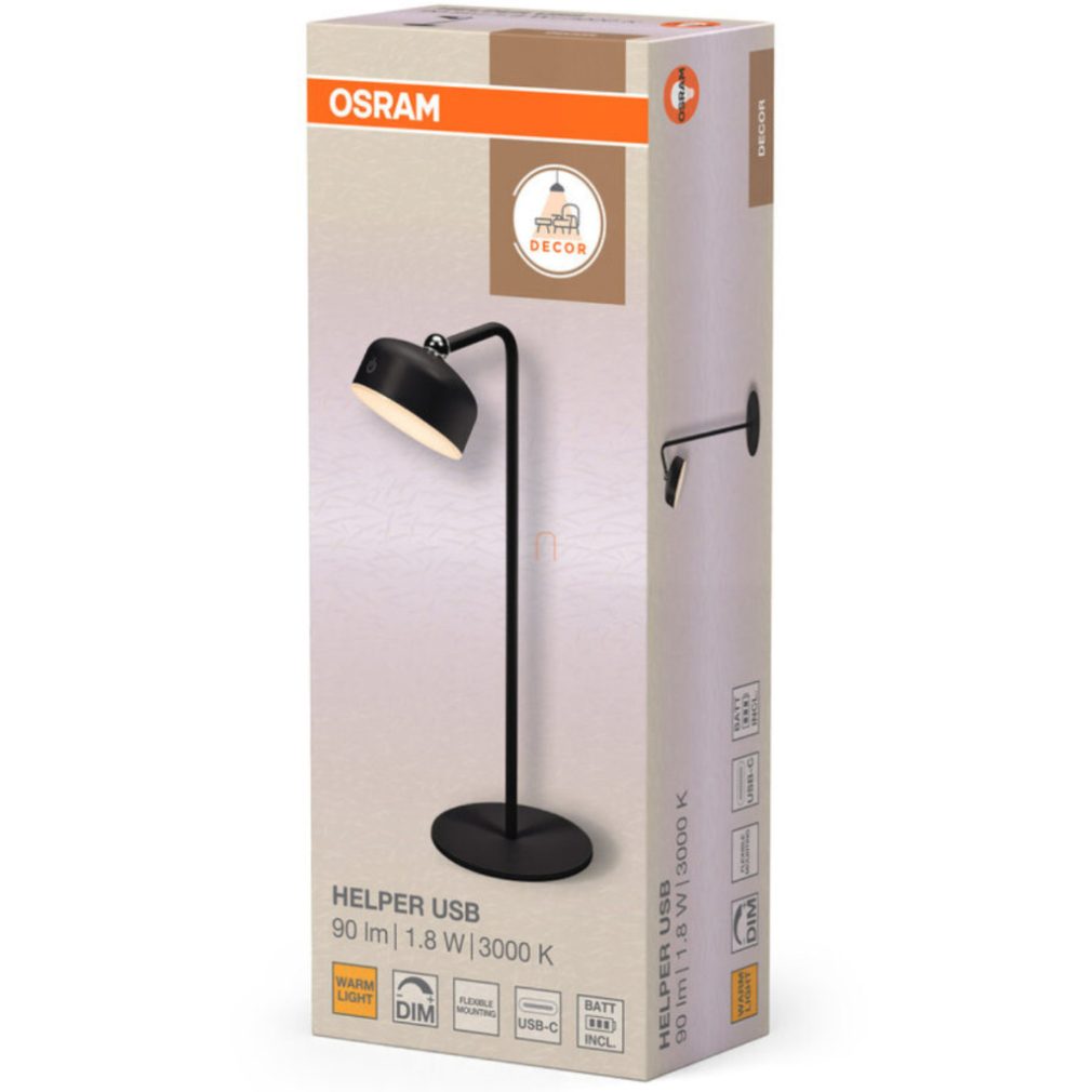 Lampă de masă reglabilă, 36,3 cm, reîncărcabilă, USB, negru - Osram Decor Helper Gadget, 3000K, 100 lm, luminozitate reglabilă, 3 niveluri, 1,8 W, 5 V