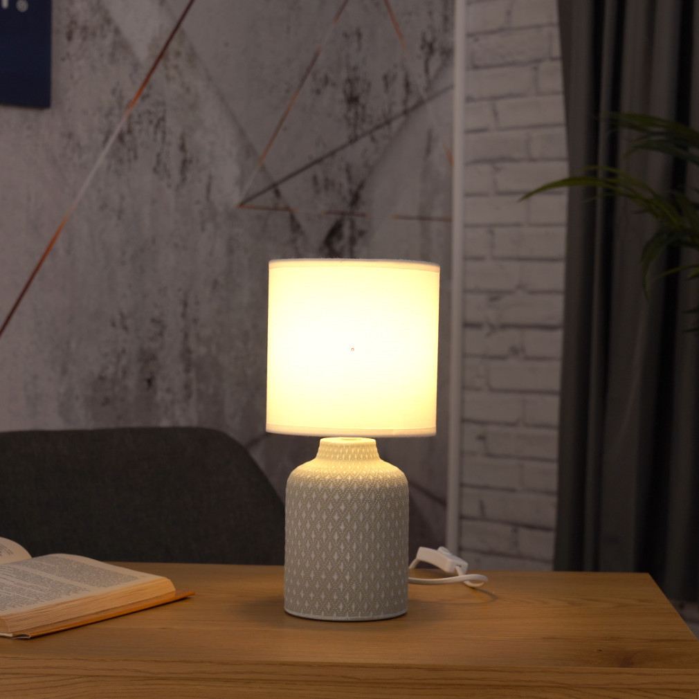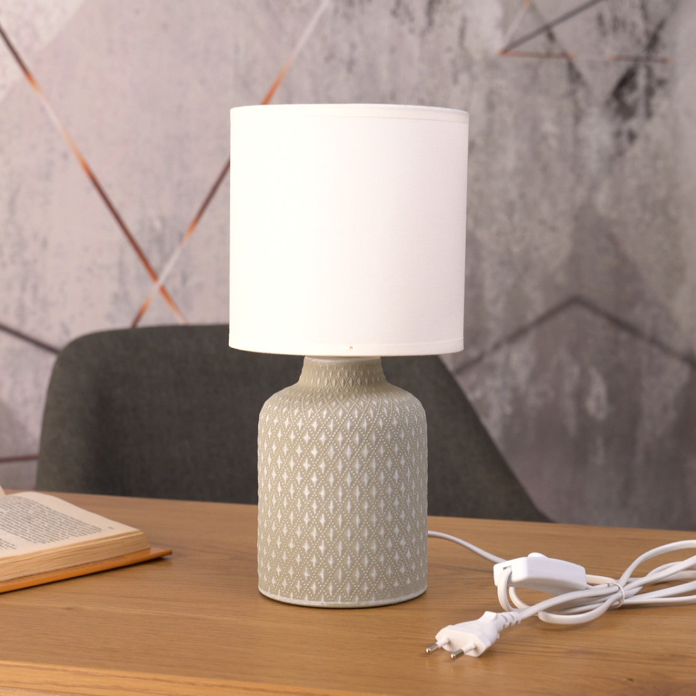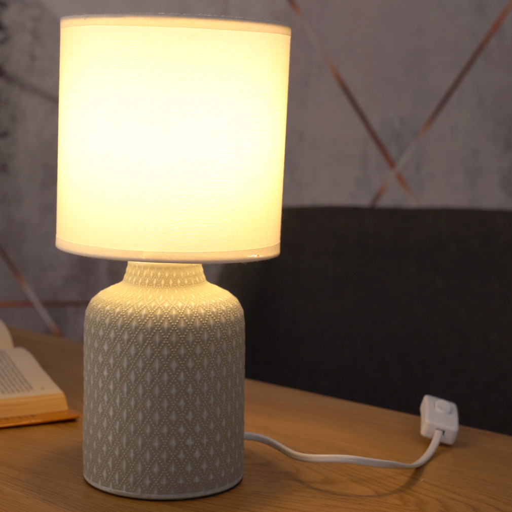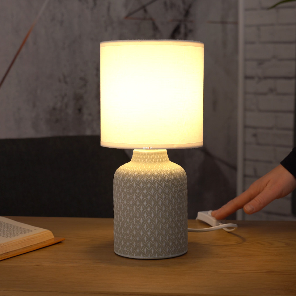Lampa de noptieră cu model Bellariva Eglo 97774 este o soluție compactă de iluminat de masă, cu o înălțime de 32 cm și un diametru de 15 cm. Lampa are un soclu E14, care poate fi echipat cu o sursă de lumină înlocuibilă, astfel încât fluxul luminos, culoarea luminii, puterea și temperatura culorii depind de becul ales. Lampa nu este reglabilă și este acționată de un întrerupător cu cordon. Produsul este în stil vintage, într-o combinație de alb și gri, realizat din materiale ceramice și textile. Are protecție IP20, fiind potrivit pentru utilizare în interior. Dimensiunile ambalajului sunt 15x15x23 cm, iar produsul cântărește 0,88 kg. Producătorul este EGLO.