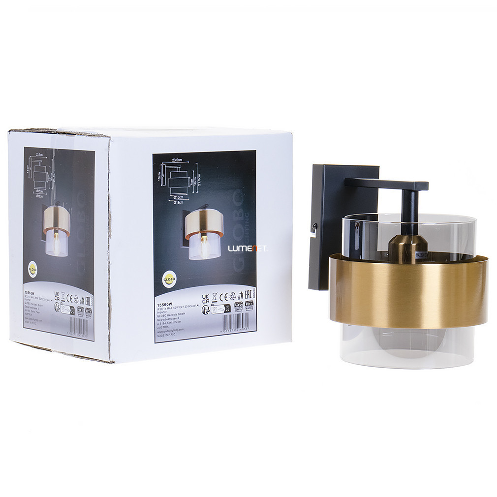 Lampa de perete din sticlă Milley Globo 15560W este proiectată într-un stil modern, în culori negru și auriu, cu o bordură decorativă aurie. Lampa este fabricată din metal și sticlă și are un singur soclu E27, care permite înlocuirea sursei de lumină. Produsul nu include o sursă de lumină și nu este reglabil. Lampa are o lungime de 235 mm, o lățime de 180 mm și o înălțime de 215 mm, și cântărește 1,49 kg. Clasa de protecție IP20 asigură utilizarea în interior. Ambalajul are o lungime de 26 cm, o lățime de 22 cm și o înălțime de 25 cm. Produsul este fabricat de Globo.