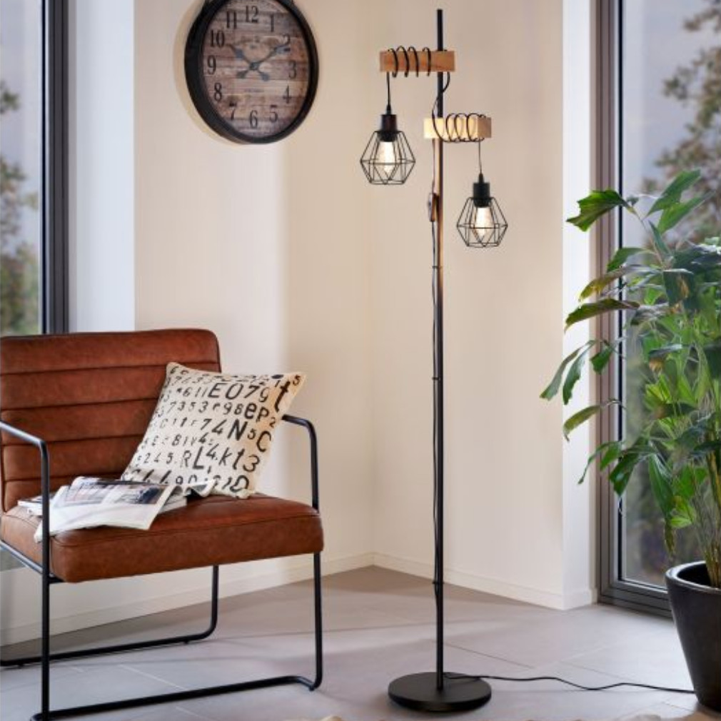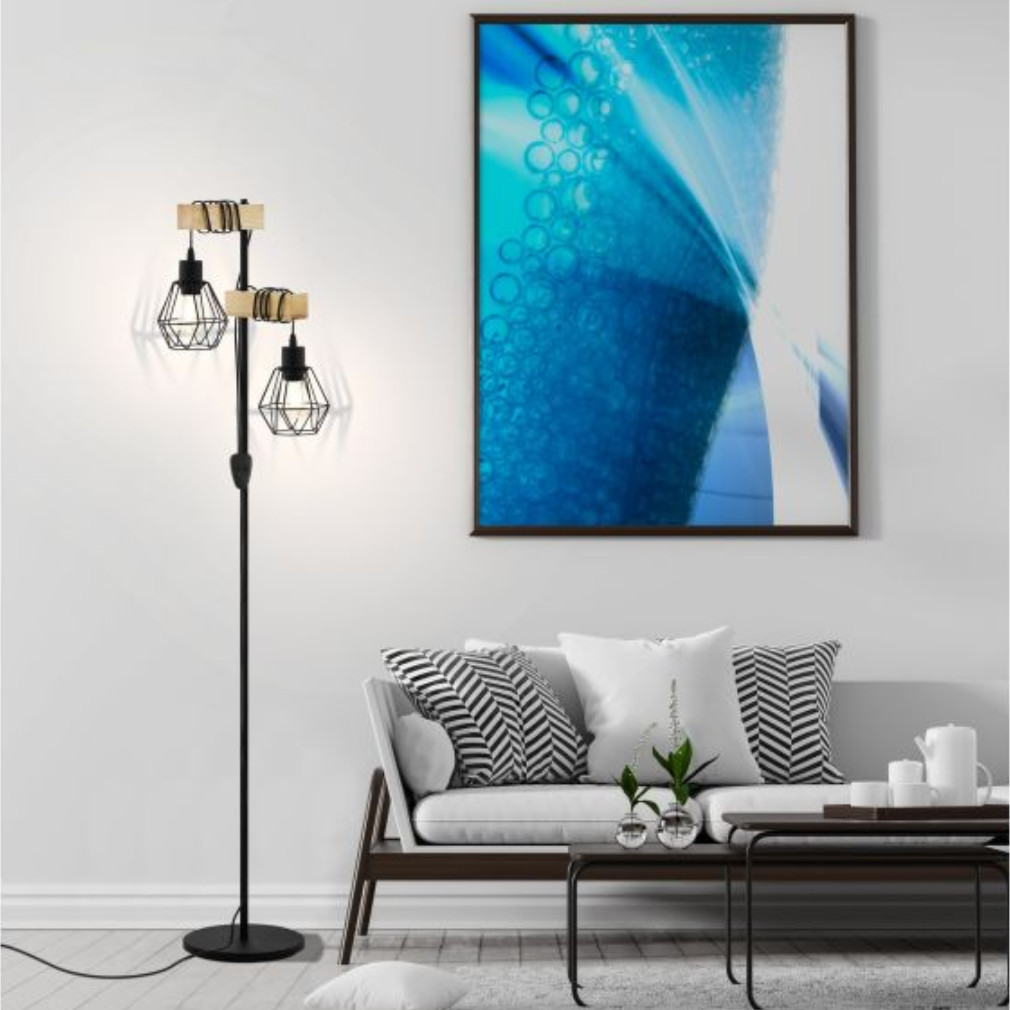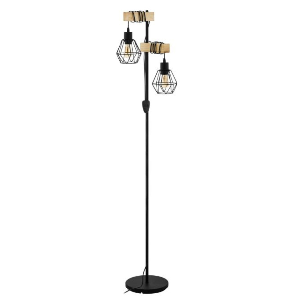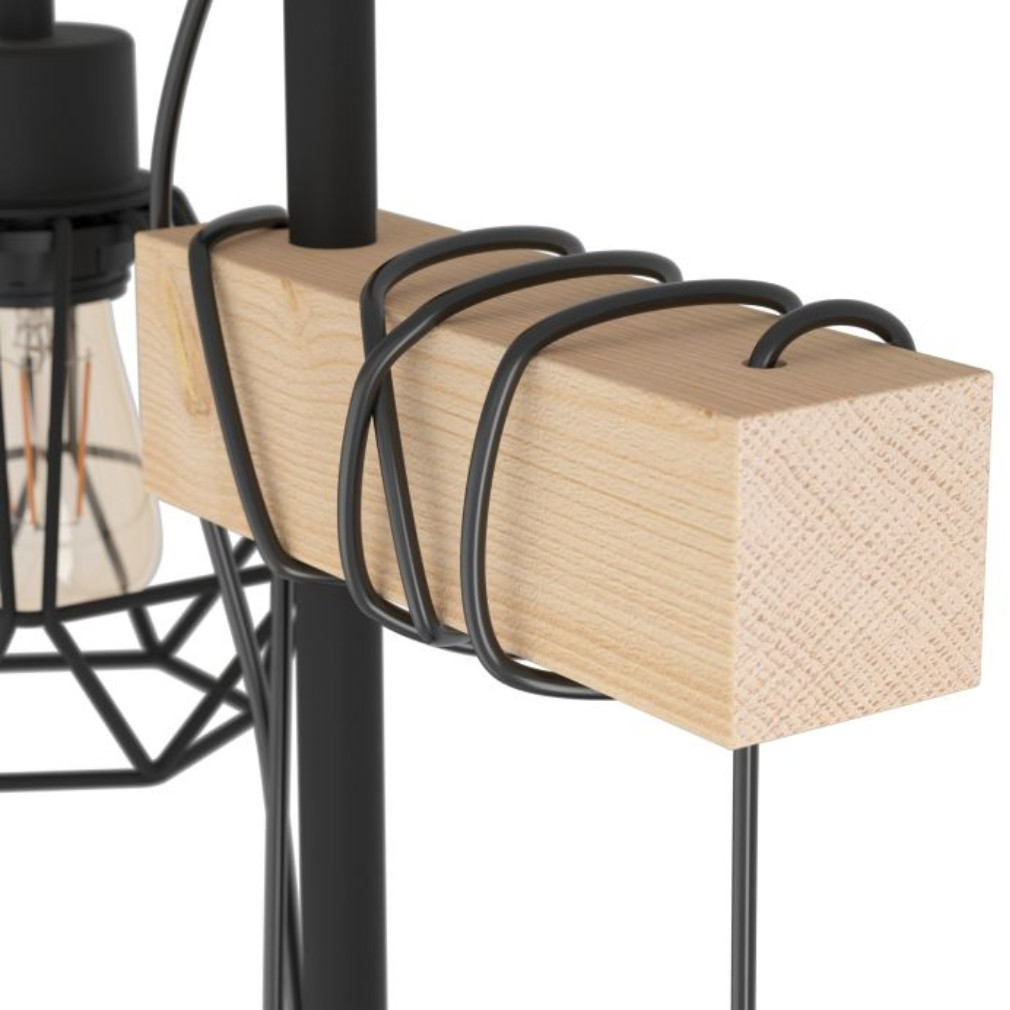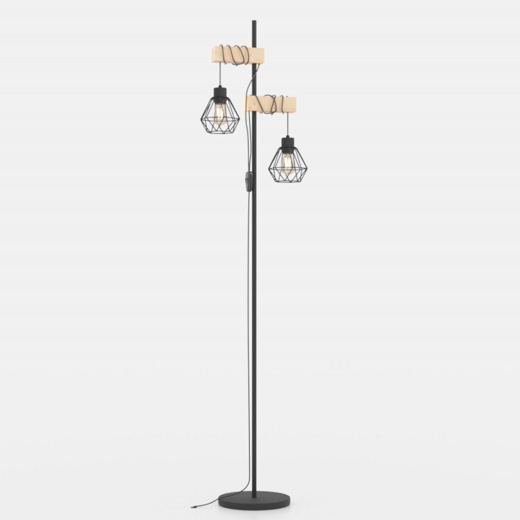 Lampă de podea cu abajur din grilaj, 167 cm, negru și culoarea lemnului - Townshend Eglo 44081, întrerupător pe cablu, soclu 2xE27