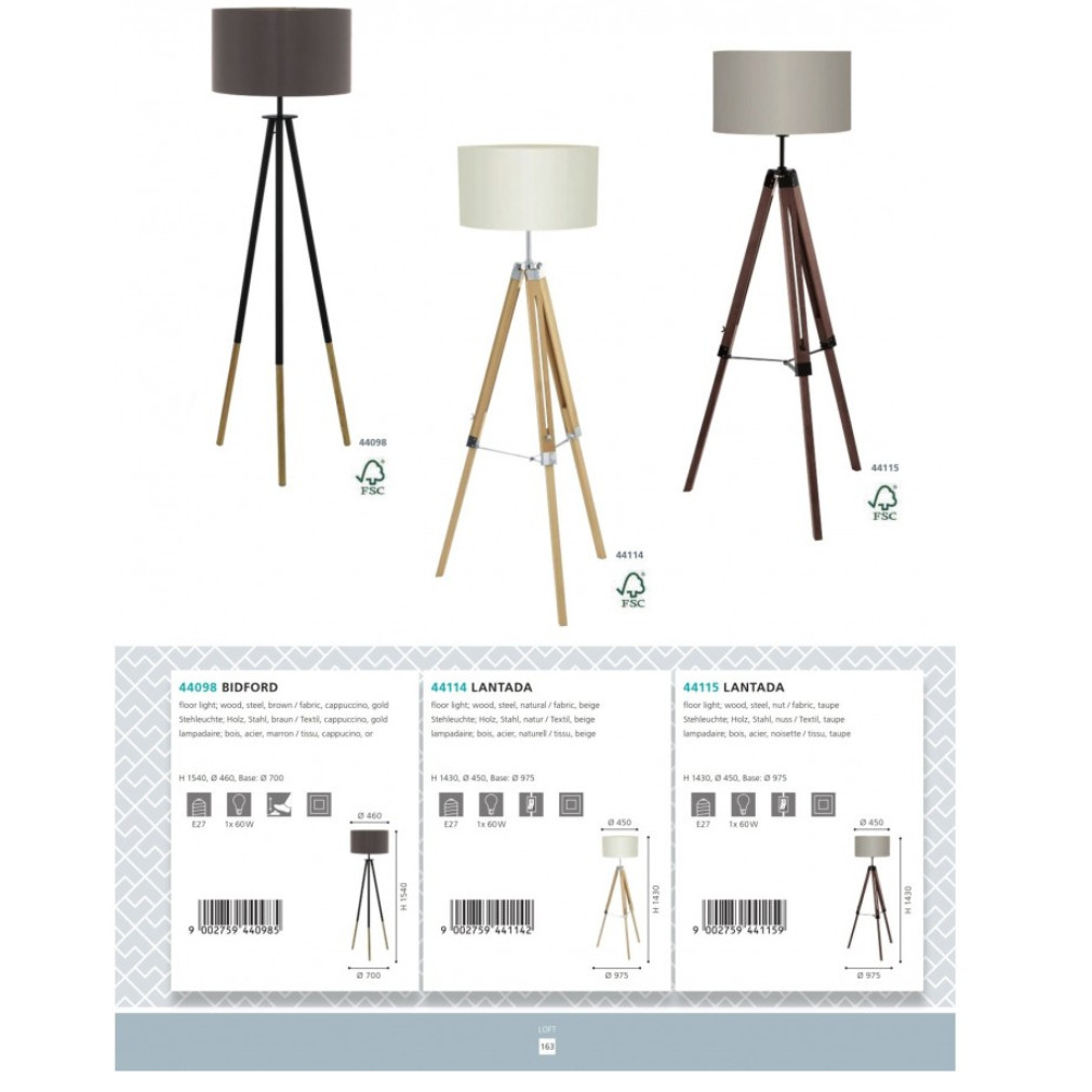 Lampa de podea Bidford Eglo 44098 are un design modern și soluții funcționale, cu o înălțime de 154 cm. Corpul lămpii este realizat dintr-o combinație de lemn, oțel și țesătură, în culori maro, auriu și negru. Este potrivită pentru utilizarea cu un singur soclu E27 și o sursă de lumină înlocuibilă, care nu este inclusă. Lampa are un grad de protecție IP20 și este concepută pentru utilizare în interior. Se controlează ușor cu un comutator cu pedală și are o lungime a cablului de 2,7 metri. Lampa de podea are un diametru de 460 mm și o înălțime de 1540 mm. Dimensiunile ambalajului sunt 48x55x42 cm și cântărește 0,14 kg. Produsul este fabricat de EGLO.