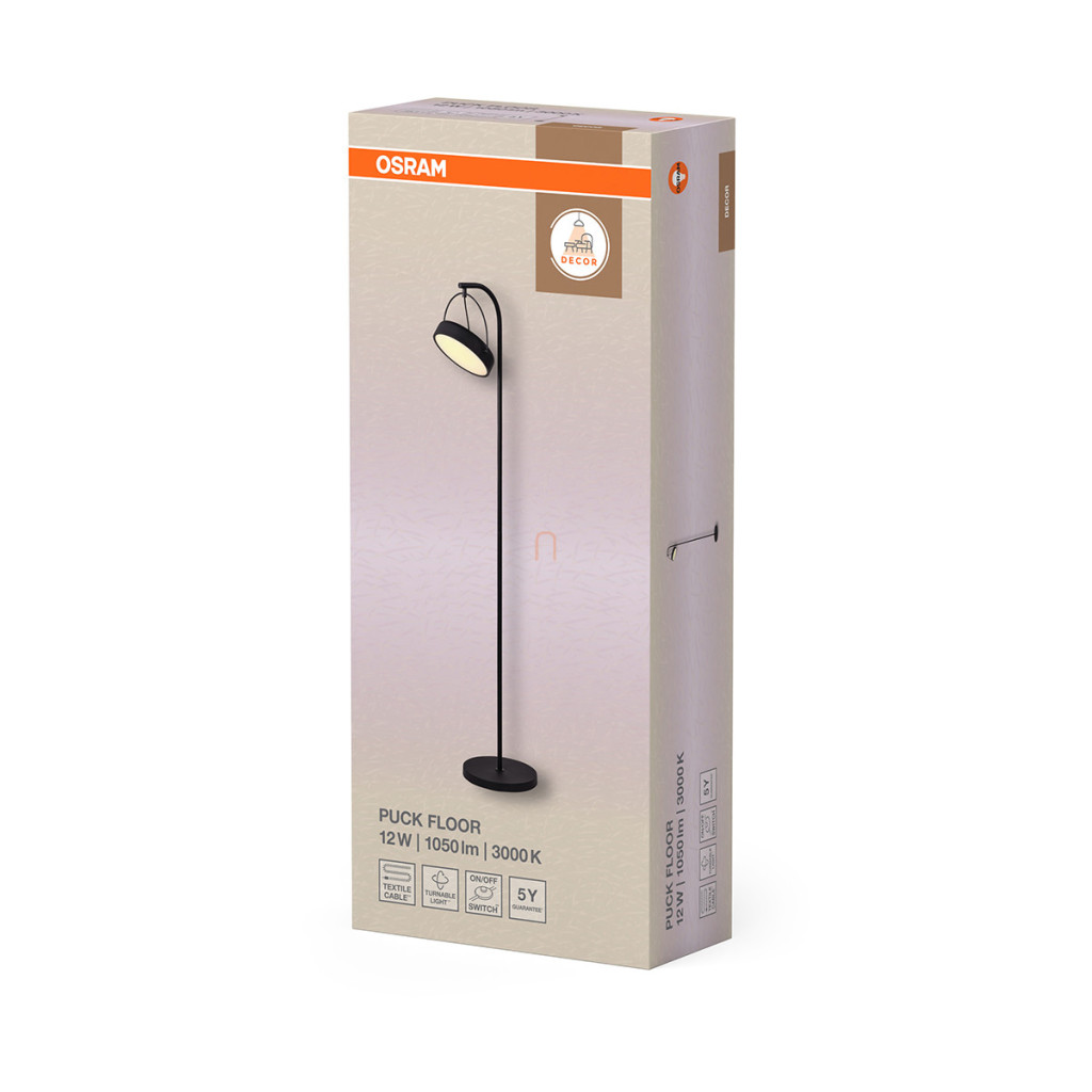 Lampă de podea cu LED, 143 cm - Osram Decor Puck, 3000 K, 590 lm, 12 W, cu cablu de 1,8 metri, 220-240 V