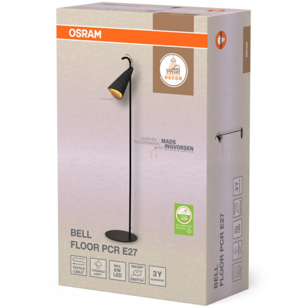 Lampă de podea, neagră, 120 cm - Osram Decor Bell, cu soclu 1xE27, cablu de 1,8 metri, 220-240 V