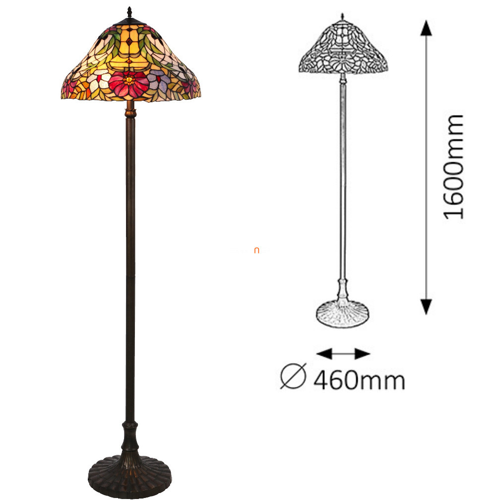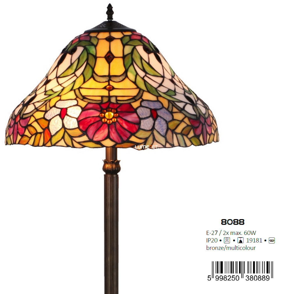 Lampa de podea Mirella Rábalux 8088 Tiffany, cu o înălțime de 160 cm și un abajur din sticlă cu un diametru de 46 cm, reprezintă stilul clasic. Materialele principale ale lămpii sunt metalul și sticla colorată, cu finisaj bronz. Are două socluri E27, care pot fi echipate cu surse de lumină înlocuibile, astfel încât fluxul luminos, culoarea luminii, puterea și temperatura culorii depind de becul ales. Este ușor de utilizat cu un comutator cu picior și nu este reglabil. Protecția IP20 îl face potrivit pentru utilizare în interior. Produsul cântărește 11,8 kg, iar dimensiunile ambalajului sunt 58 x 54 x 31 cm. Lampa nu include sursa de lumină; producătorul este Rábalux.