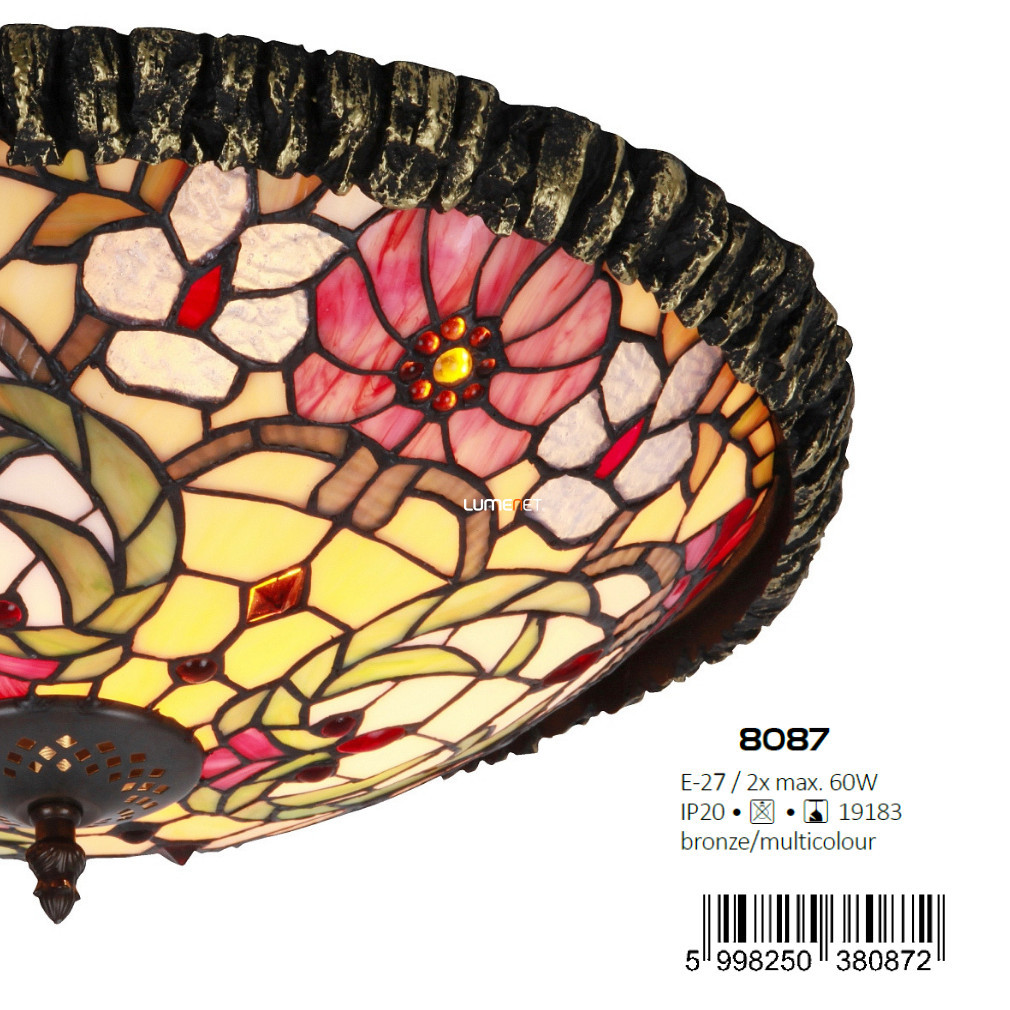Lampa de tavan Mirella Rábalux 8087 are două socluri E27, astfel încât poate fi utilizată cu surse de lumină înlocuibile. Lampa în stil Tiffany este realizată din metal și sticlă colorată, în nuanțe de bronz. Lampa are un diametru de 440 mm, o înălțime de 160 mm și o greutate totală de 6,5 kg. Produsul are protecție IP20, fiind potrivit pentru utilizare în interior. Lampa nu include o sursă de lumină; puterea, fluxul luminos și temperatura culorii pot varia în funcție de becurile utilizate. Mirella Rábalux 8087 nu are luminozitate reglabilă. Dimensiunile ambalajului sunt: 52 cm lățime, 52 cm lungime și 22 cm înălțime. Produsul este fabricat de Rábalux.