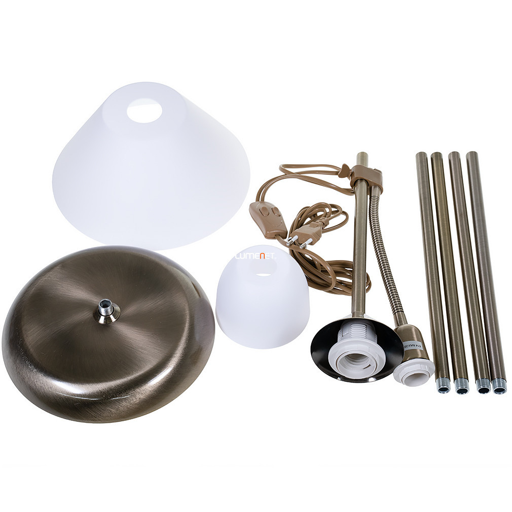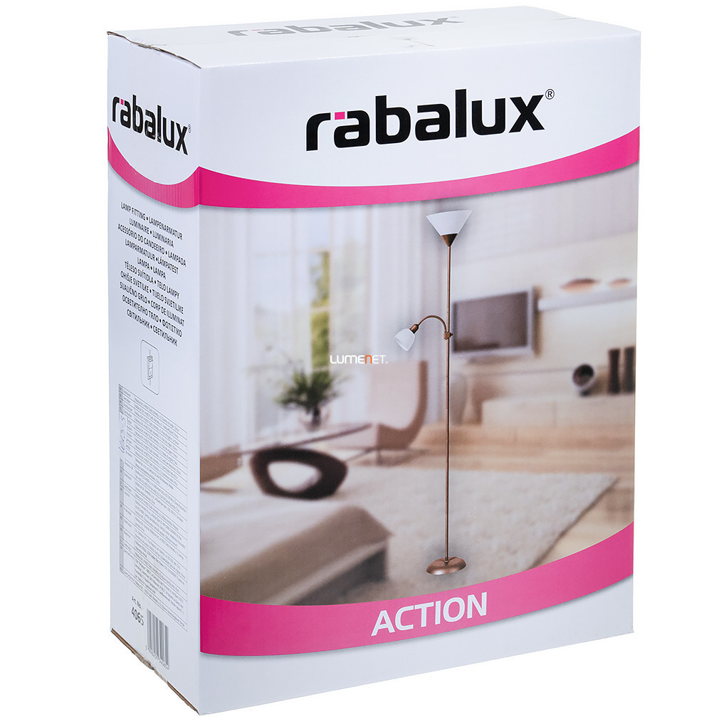 Lampa de tavan din bronz cu braț de citit, înaltă de 178 cm, model Action Rábalux 4065, este o lampă de podea în stil modern, cu două tipuri de socluri – 1xE27 și 1xE14 – care permit utilizarea diferitelor tipuri de surse de lumină. Corpul lămpii este realizat din elemente metalice și plastice de culoare albă și bronz, iar designul său asigură protecție IP20. Produsul este acționat de un întrerupător cu cablu, iar sursele de lumină nu sunt incluse în pachet, astfel încât pot fi selectate separat. Greutatea totală a lămpii este de 3,61 kg, diametrul său este de 242 mm, înălțimea sa este de 1780 mm, iar ambalajul are 27 cm lățime, 13 cm lungime și 36 cm înălțime. Produsul nu are luminozitate reglabilă; temperatura culorii și fluxul luminos variază în funcție de sursele de lumină utilizate.