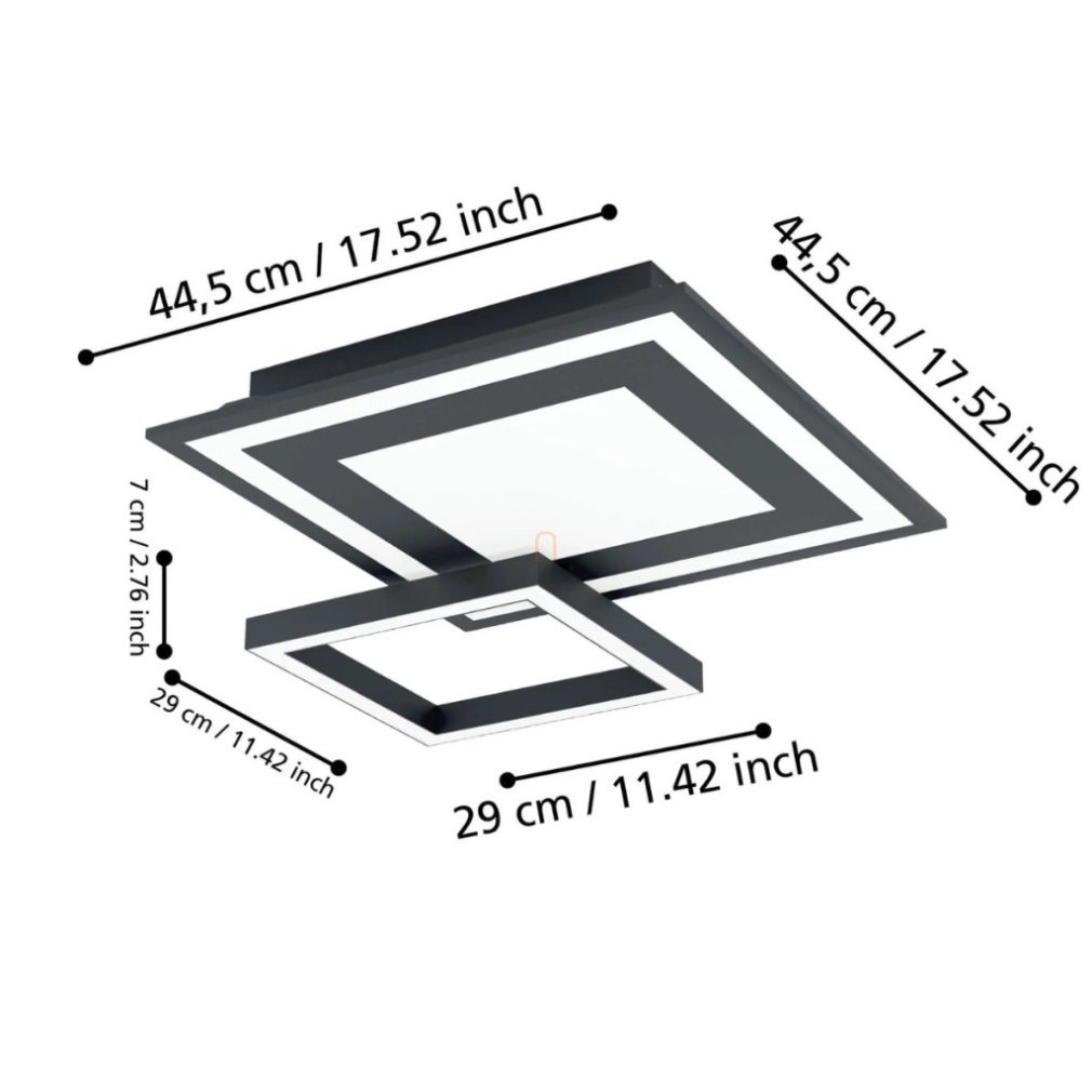 Lampa inteligentă de tavan Savatarila-Z-RGBW Eglo 900025 dispune de tehnologie LED modernă și setări de lumină reglabile. Corp de iluminat oferă un flux luminos de 1320 lumeni, cu o temperatură de culoare care poate fi reglată între 2700 și 6500 Kelvin și o funcție RGBW care permite diferite culori și nuanțe de alb. Modulele LED 4x2,7+4x2,7 W permit o funcționare eficientă din punct de vedere energetic. Utilizarea materialelor din oțel și plastic și combinația de culori alb-negru conferă lămpii un aspect modern. Designul cadrului decalat creează un efect vizual unic. Iluminatul poate fi controlat prin intermediul unei aplicații și al unei telecomenzi disponibile separat. Corpul de iluminat de 450x450x70 mm are protecție IP20, fiind potrivit pentru utilizare în interior. Modulul LED încorporat include și sursa de lumină, astfel încât nu este necesară achiziționarea unui bec separat.