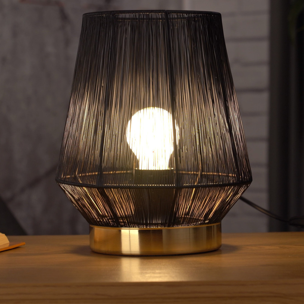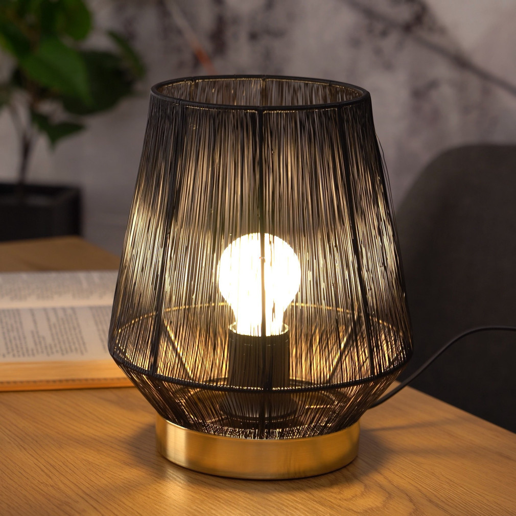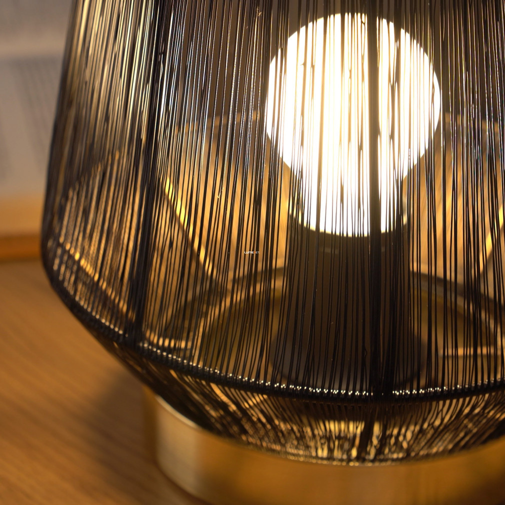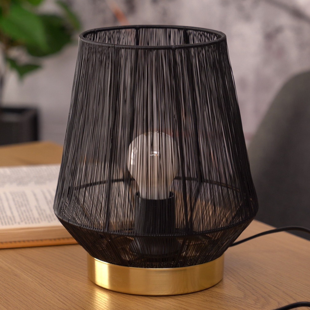 Lampa decorativă Escandidos Eglo 99808 cu cablu din oțel are un design elegant, cu o înălțime de 26 cm, abajur negru și bază aurie. Lampa are un soclu E27, care permite înlocuirea sursei de lumină, astfel încât fluxul luminos, temperatura culorii și puterea depind de becul ales. Lampa de masă cu întrerupător pe cablu nu este reglabilă și are un grad de protecție IP20, fiind potrivită pentru utilizare în interior. Lampa are un diametru de 22 cm, cântărește 1,31 kg și are dimensiuni de ambalare de 23x23x27 cm. Produsul este fabricat de EGLO, sursa de lumină nu este inclusă.