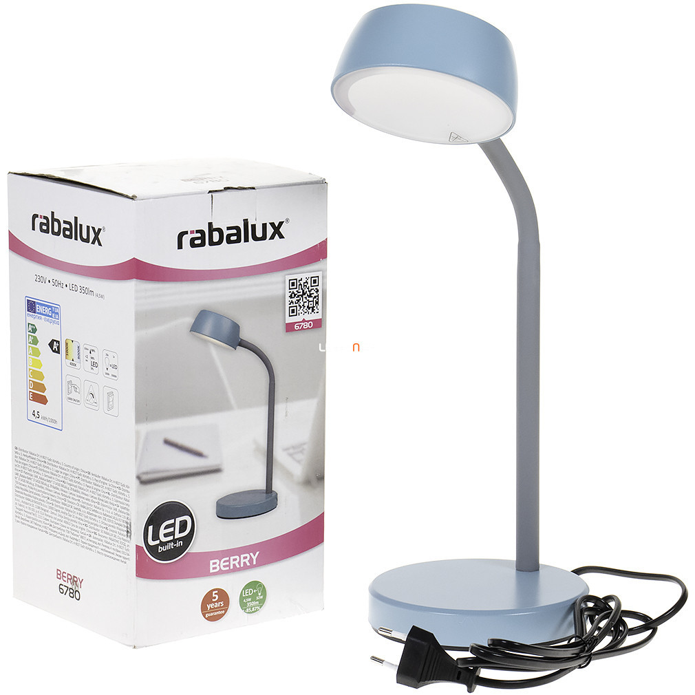 Lampa LED de birou Berry Rábalux 6780 albastră este o soluție modernă de iluminat cu o înălțime de 35 cm, care funcționează cu un modul LED încorporat de 4,5 W. Lampa are un flux luminos de 350 lumeni și o temperatură de culoare de 4000 Kelvin, oferind o lumină albă rece, ideală pentru un mediu de lucru. Produsul are protecție IP20, fiind potrivit pentru utilizare în interior. Lampa este fabricată din metal și materiale plastice și prezintă o combinație de culori albastru și gri. Durata medie de viață a dispozitivului este de 20.000 de ore, iar dimensiunile sale sunt de 250 mm lungime, 140 mm lățime și 350 mm înălțime. Sursa de lumină LED nu este înlocuibilă, iar lampa nu este reglabilă. Producătorul este Rábalux, iar codul logistic al produsului este 6780.