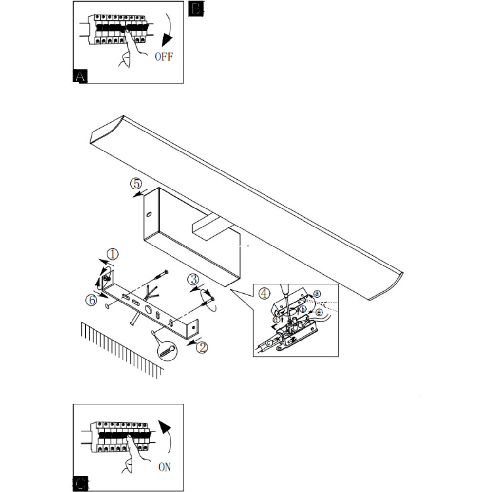 Lampa cu oglindă LED Tabiano Eglo 94614, cu design modern și modul LED încorporat de 6,4 W, oferă o putere luminoasă de 600 lumeni și o iluminare albă rece, cu o temperatură de culoare de 4000 K. Lampa are o lungime de 40,5 cm, o înălțime de 7 cm și este fabricată din oțel și plastic de culoare nichel. Produsul are protecție IP20, fiind potrivit pentru utilizare în interior, în special pentru iluminarea oglinzilor din baie sau a suprafețelor de perete. Nu este reglabilă, iar sursa de lumină LED este încorporată, astfel încât nu trebuie înlocuită. Lampa cântărește 0,6 kg, iar dimensiunile ambalajului sunt de 8x14x42 cm. Produsul este fabricat de EGLO.