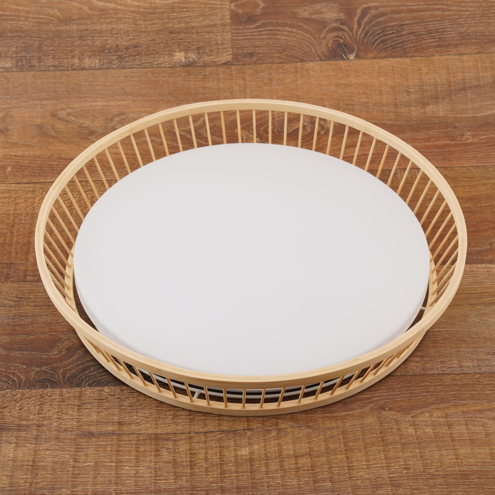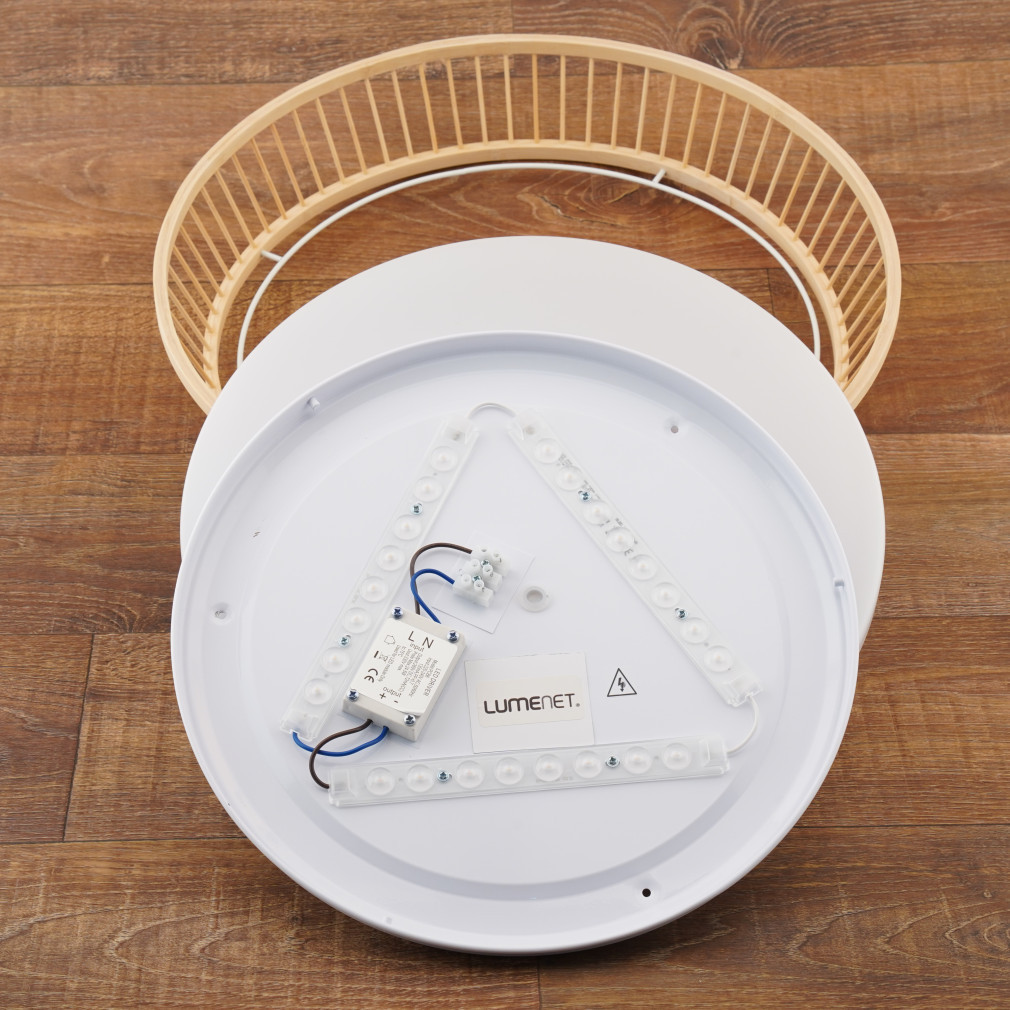 Lampa LED pentru tavan Bamboo - Luppineria Eglo 900797 este o soluție modernă de iluminat pentru locuințe, care funcționează cu un modul LED de 20 W. Corpul de iluminat are un flux luminos de 2400 lumeni și oferă o lumină albă caldă, cu o temperatură de culoare de 3000 Kelvin, creând o atmosferă plăcută în încăpere. Lampa este fabricată din lemn, oțel și plastic și este disponibilă într-o combinație de maro și alb. Produsul are un diametru de 450 mm, o înălțime de 95 mm și un grad de protecție IP20, fiind potrivit pentru utilizare în interior. Sursa de lumină LED este încorporată și nu necesită înlocuire. Lampa cântărește 0,683 kg, iar dimensiunile ambalajului sunt 46x47x11 cm. Producătorul este EGLO, iar codul logistic al produsului este 900797.
