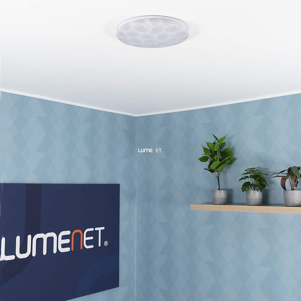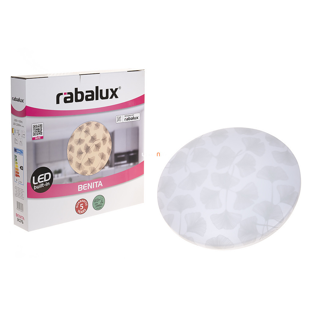 Lampa LED pentru tavan cu frunze de ginkgo, model Benita Rábalux 3076, oferă o soluție modernă de iluminat pentru locuințe, cu un modul LED integrat de 24 W. Corpul de iluminat asigură un flux luminos de 1200 lumeni, emițând o lumină albă caldă cu o temperatură de culoare de 3000 K. Produsul nu este reglabil, iar sursa de lumină nu poate fi înlocuită, deoarece modulul LED este încorporat. Corpul de iluminat are un diametru de 380 mm, o înălțime de 70 mm și o greutate de 0,8 kg. Corpul de iluminat alb și gri, fabricat din metal și plastic, are protecție IP20, fiind potrivit pentru utilizare în interior. Durata medie de viață este de 25.000 de ore, iar dimensiunile ambalajului sunt de 39x39x7 cm. Produsul este fabricat de Rábalux.