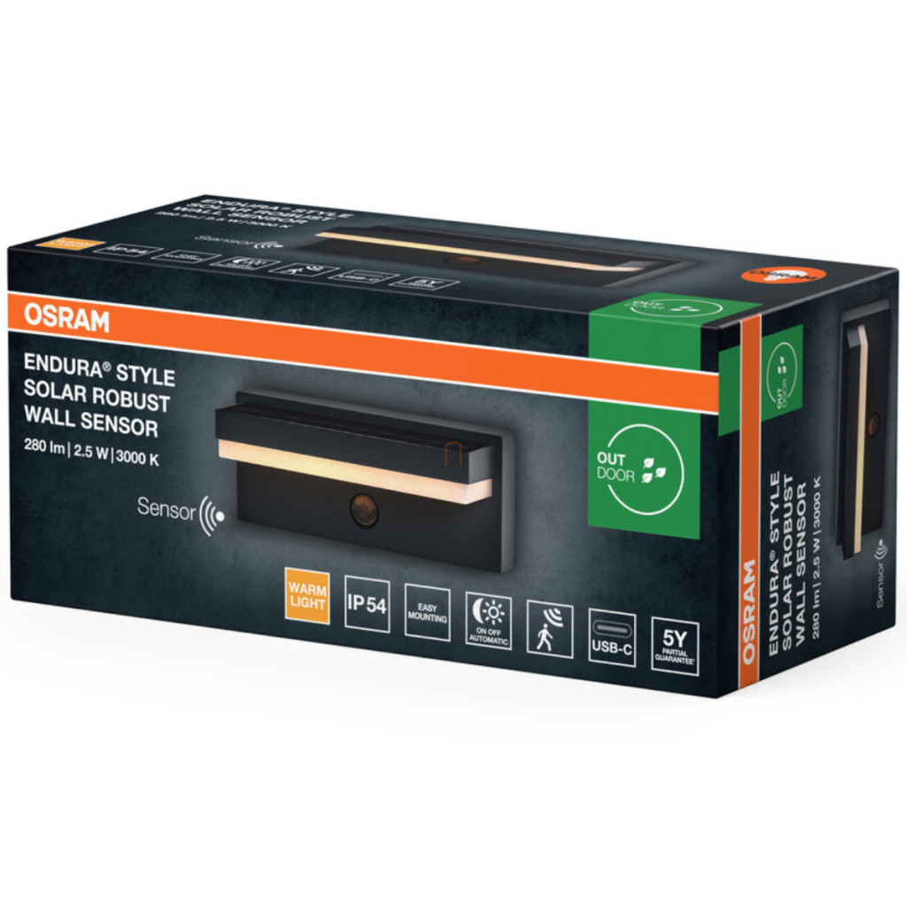 Lampă LED de exterior cu senzor de mișcare, senzor de lumină - Osram Endura Sty Sol Robust, 3000 K, 180 lm, IP54, 3,7 V