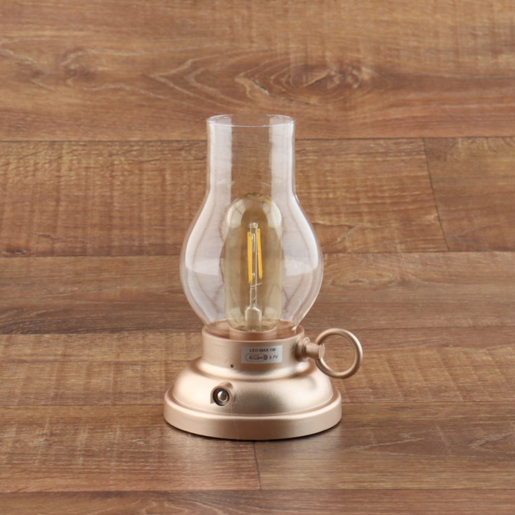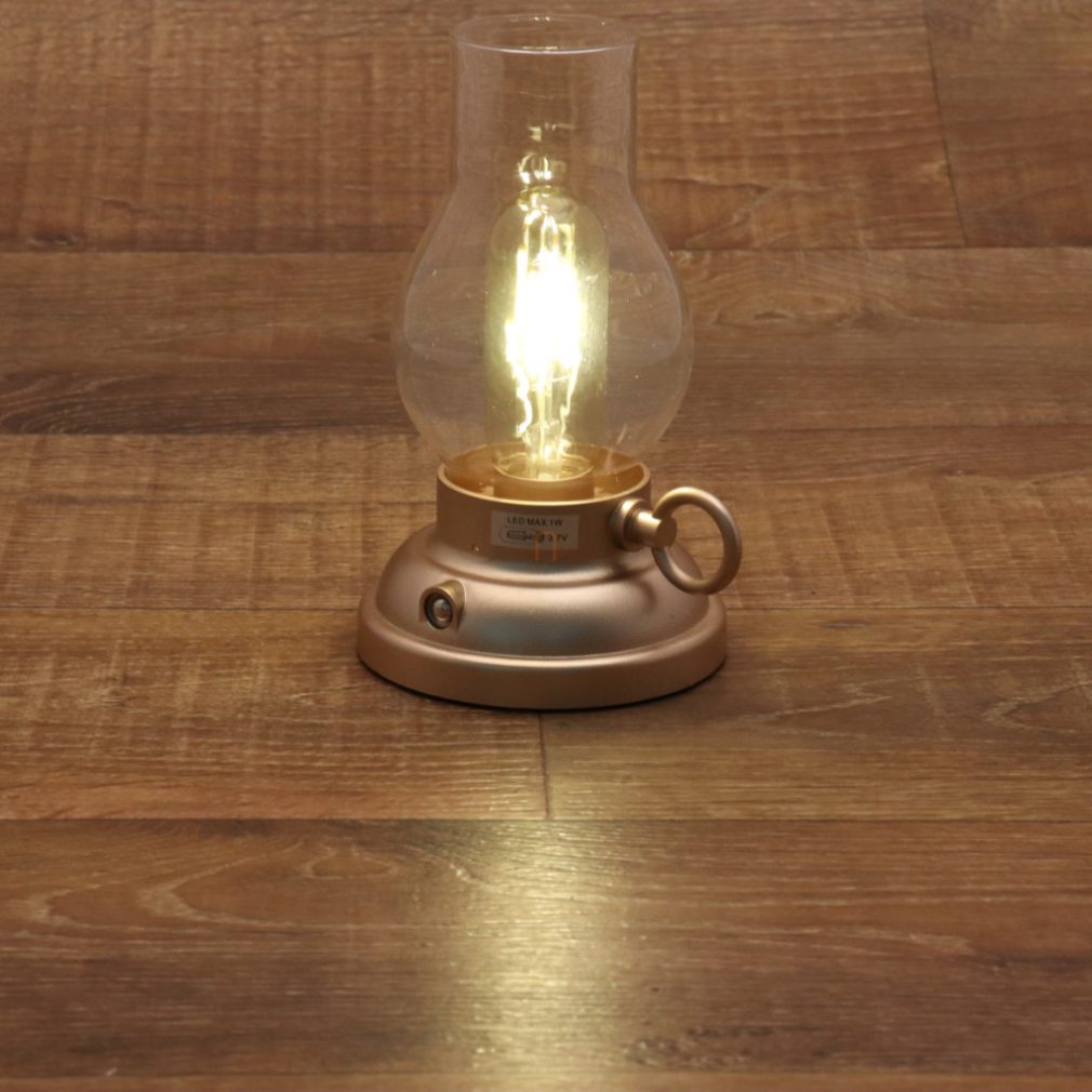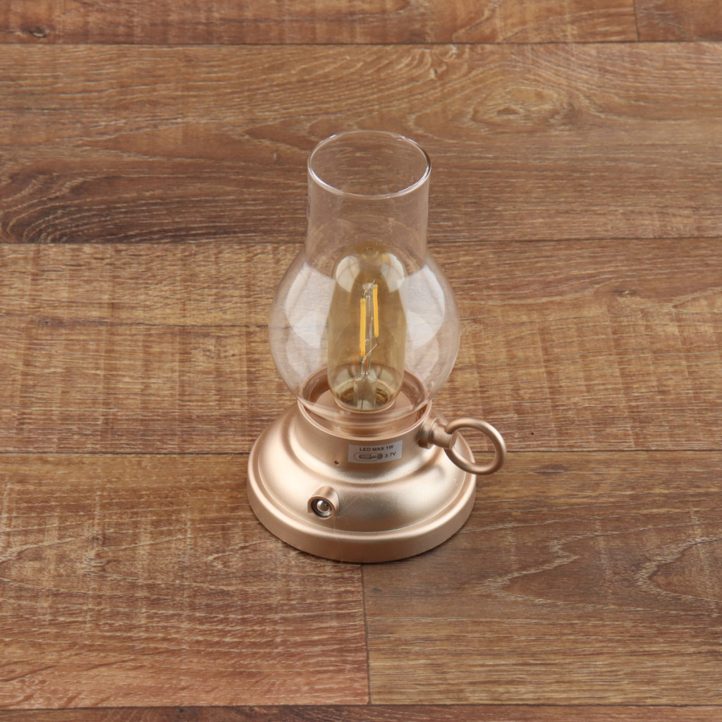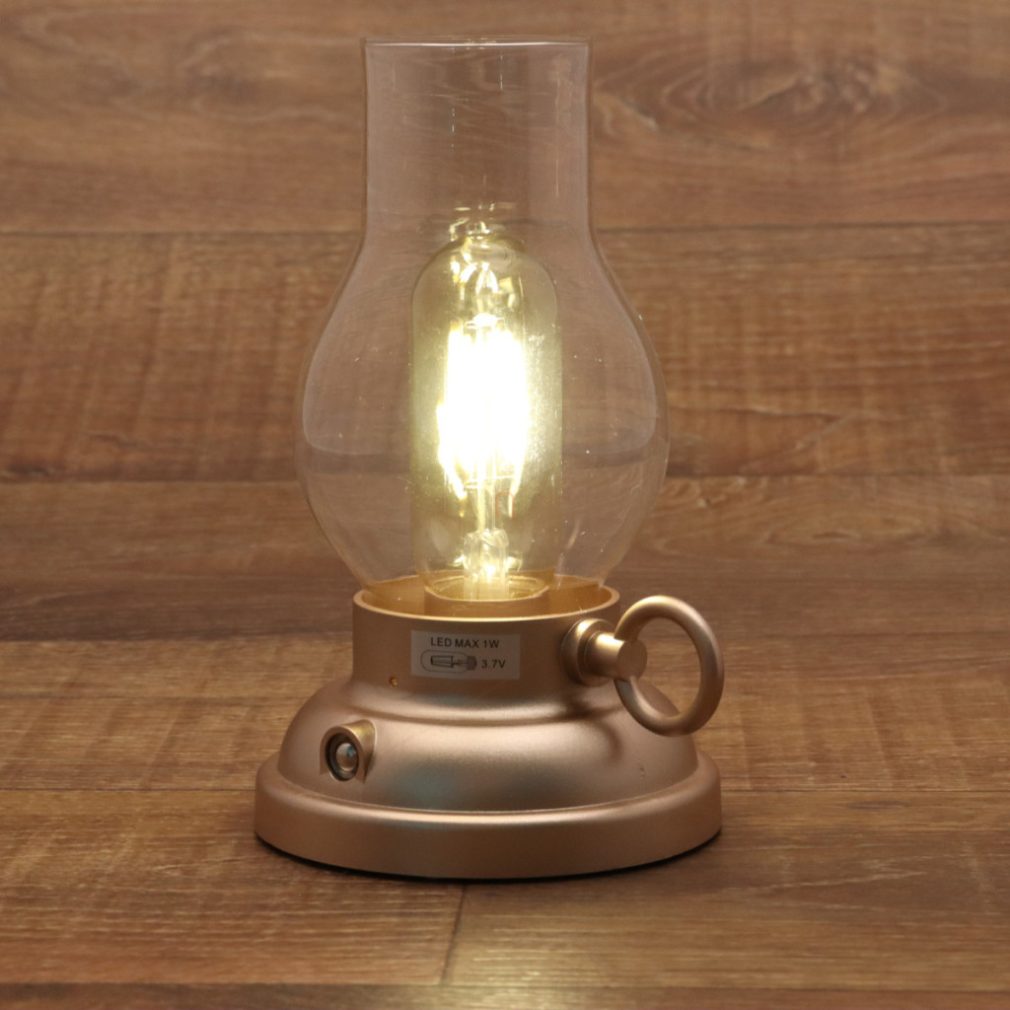 Lampă LED de masă cu activare tactilă, reîncărcabilă, efect de lampă cu petrol, culoare șampanie - Petro Globo 58016CH - luminozitate reglabilă, 2700 K, 65 lm, 1 W, cablu de 1 metru, alimentată cu baterii
