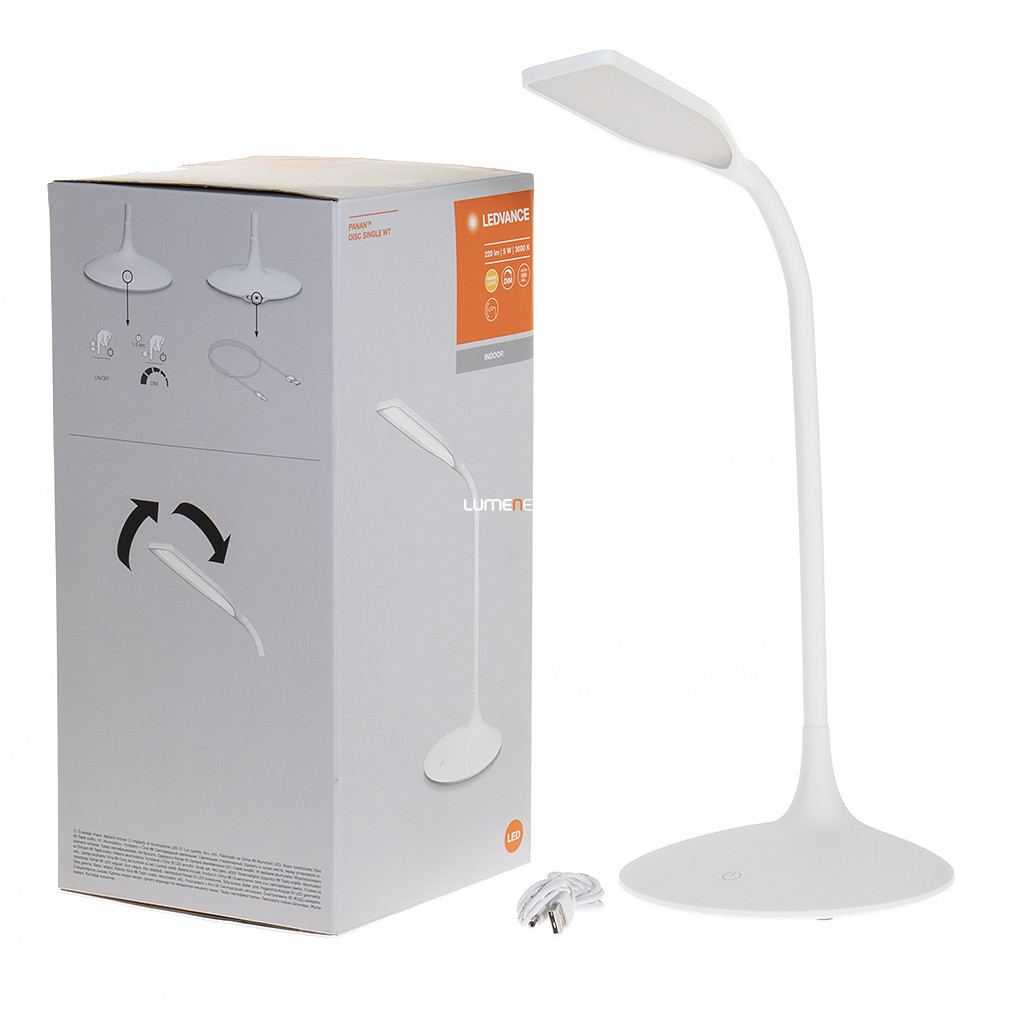 Lampa LED de masă Ledvance Panan Disc Single are un comutator tactil pentru reglarea intensității luminoase, permițându-vă să reglați cu precizie iluminatul. Corpul de iluminat de 220 lumeni oferă o lumină albă caldă (3000 K), creând o atmosferă plăcută. Funcționează cu o baterie reîncărcabilă încorporată, fiind potrivită pentru utilizare fără cablu. Lampa este echipată cu un modul LED de 5 W, care are o eficiență luminoasă de 44 lm/W și o durată de viață medie de până la 30.000 de ore. Carcasa modernă din plastic alb are protecție IP20, fiind potrivită pentru utilizare în interior. Are o lungime de 350 mm, o lățime de 170 mm și o înălțime de 370 mm, fiind potrivită pentru birouri sau noptiere. Corpul lămpii conține sursa de lumină, iar modulul LED nu poate fi înlocuit.