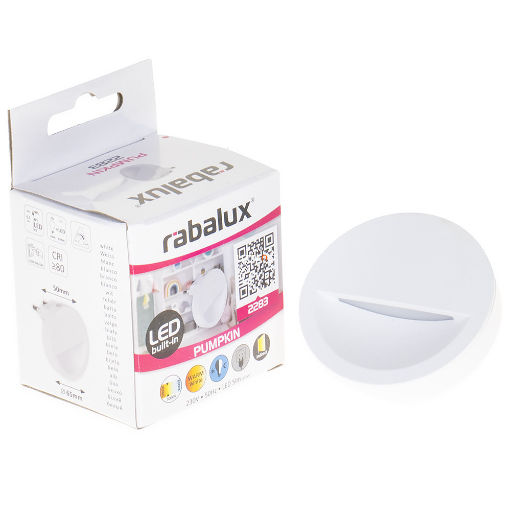 Lampa LED Pumpkin Rábalux 2283 Night, Semicircle este un dispozitiv funcțional de iluminat pentru locuințe, de culoare albă, cu carcasă din plastic, conceput în principal pentru utilizare pe timp de noapte. Lampa funcționează cu un modul LED integrat de 0,5 W, care oferă un flux luminos de 5 lumeni cu o temperatură de culoare albă caldă de 3000 K. Senzorul de lumină încorporat reglează automat iluminarea în funcție de condițiile de lumină din mediul înconjurător. Clasa de protecție IP20 permite utilizarea în interior. Lampa are un diametru de 65 mm, o înălțime de 50 mm, o greutate de 0,05 kg și o durată medie de viață de 25.000 de ore. Produsul este fabricat de Rábalux și are dimensiuni de ambalare de 7x5x7 cm. Sursa de lumină LED face parte din corp de iluminat.